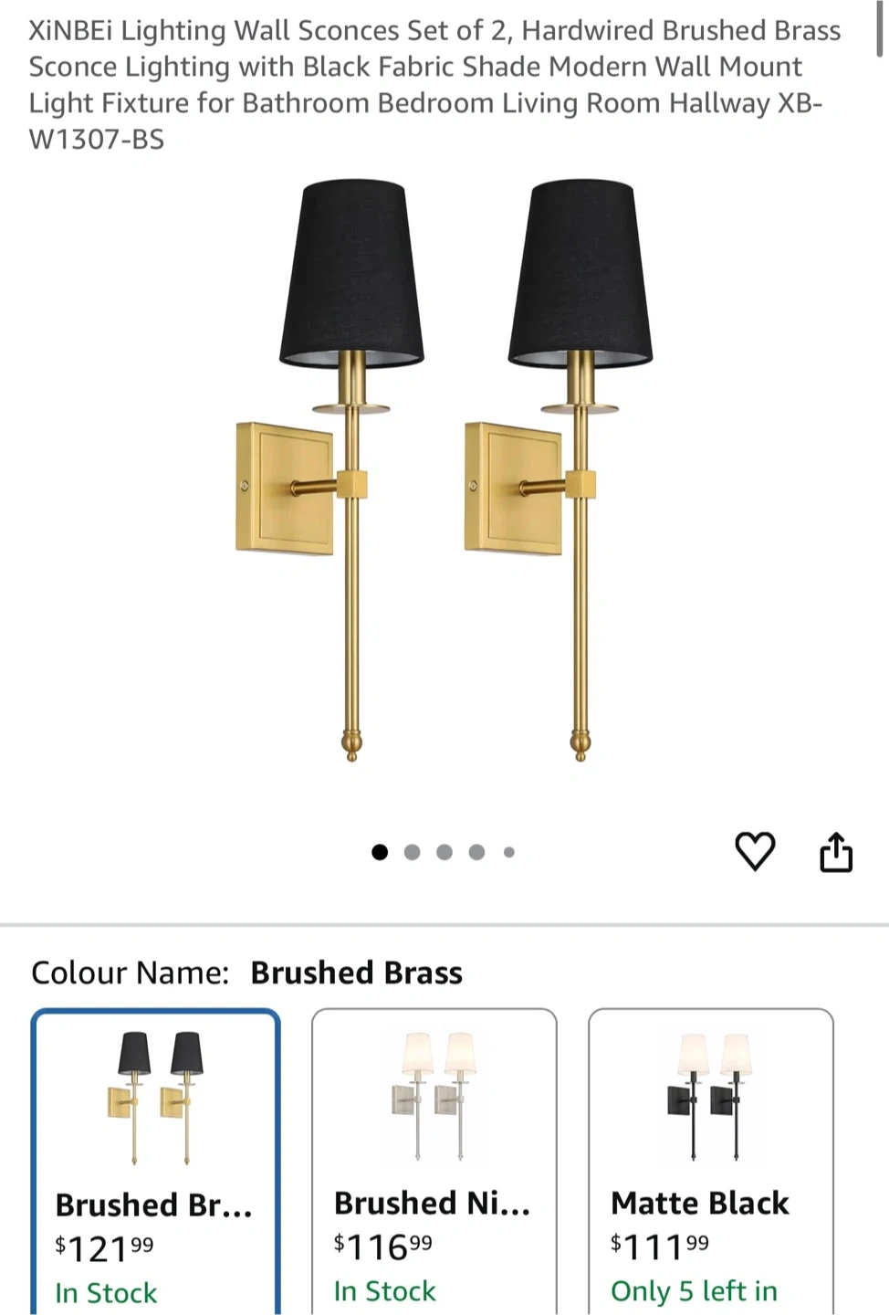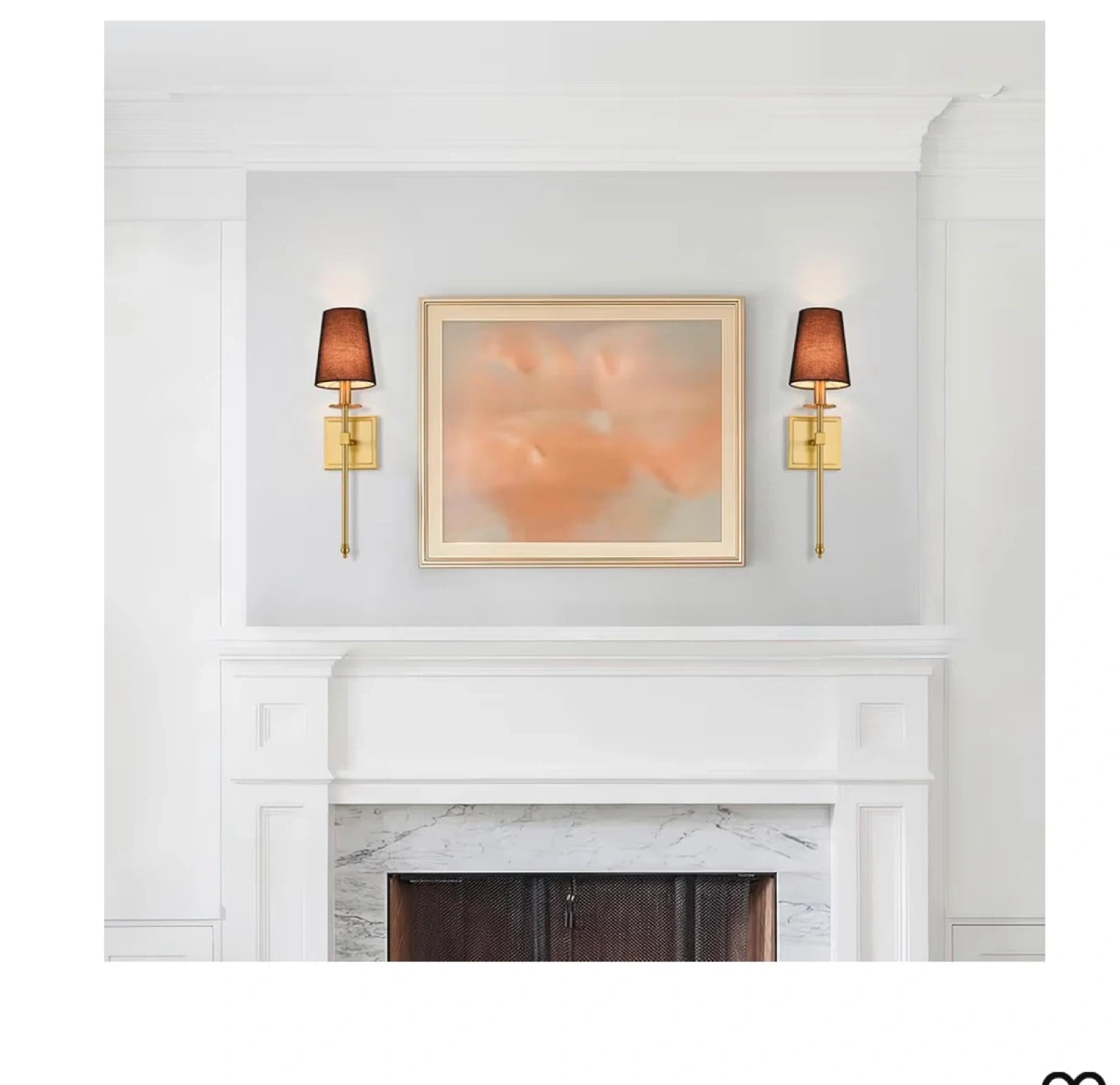 Selling a set of XinBei wall sconces in brushed brass finish! These sconces feature a black fabric shade and a hardwired wall mount. Perfect for adding a touch of elegance to your bathroom, bedroom, living room, or hallway. Dimensions are approximately 20" in height with a 5" shade diameter. Bulbs are NOT included