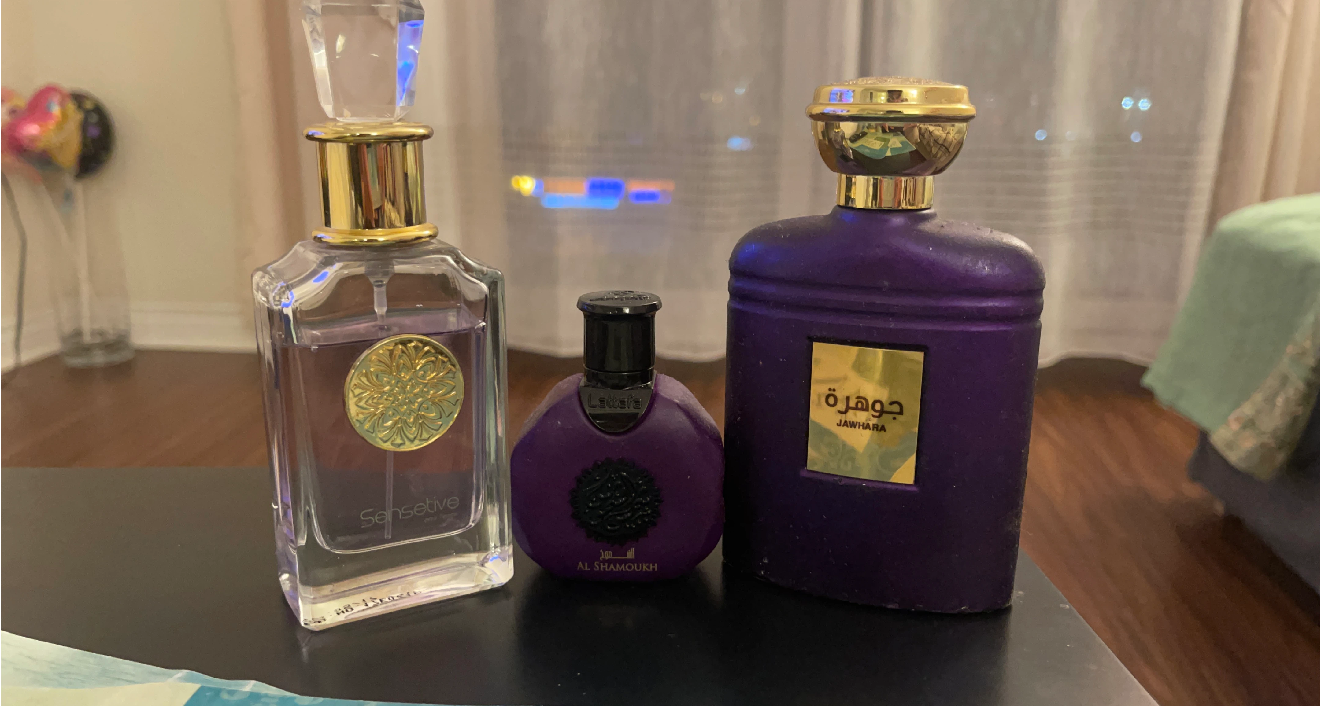 Selling a selection of perfume bottles. Includes 'Sensetive pour femme' and 'Al Shamoukh' and Jawhara. More then 50 percent in each bottle .