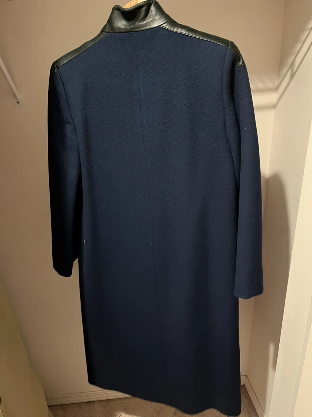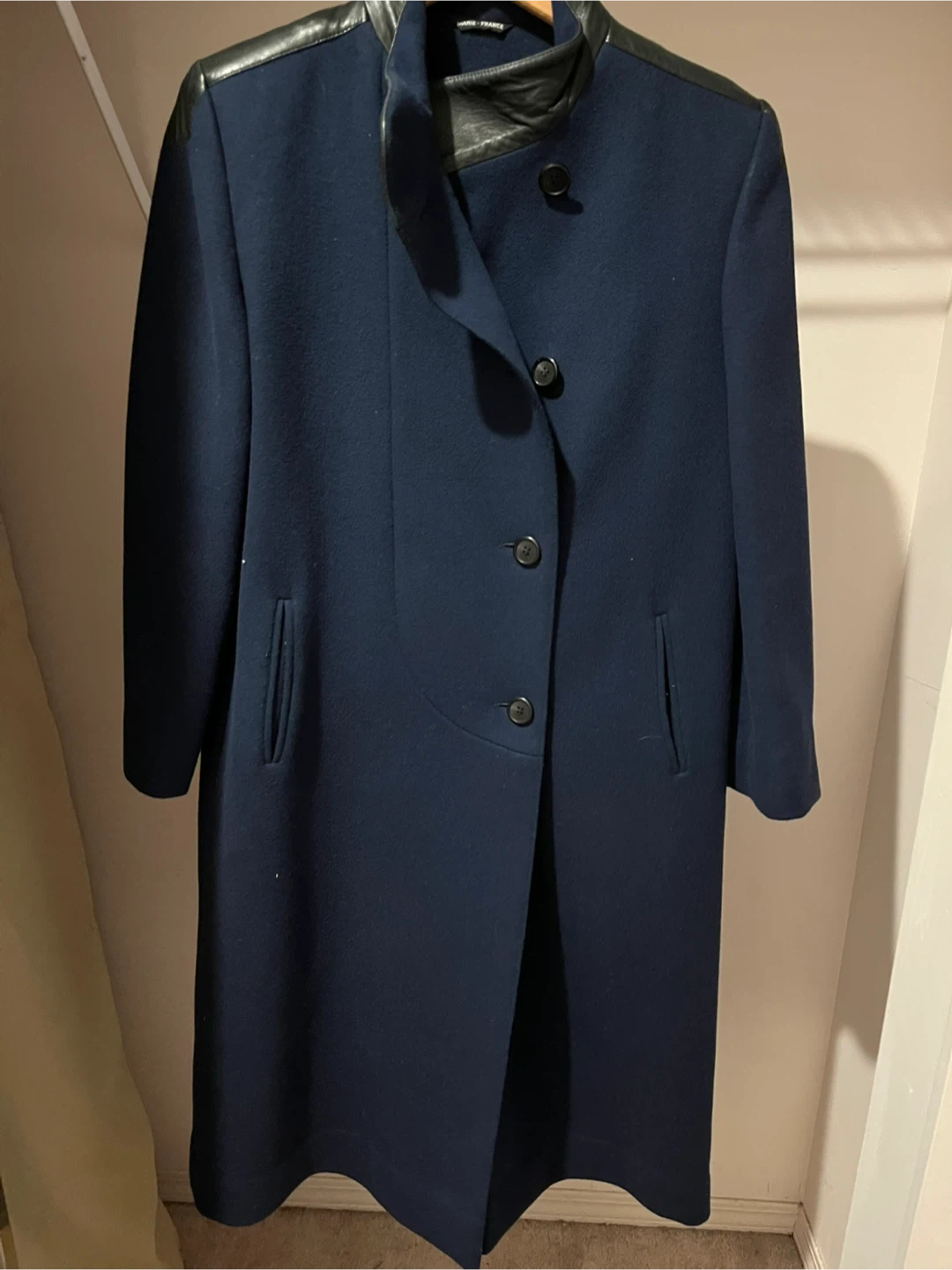 A heavy quality 100% wool navy blue, with black leather accents on neckline, shoulders - fully lined coat. Vintage 1970's. Marie France Brand - Montreal. No size tag inside but fits as a Women's small. DM for measurements. It features black leather detailing around the collar and shoulders, giving it a unique and sophisticated look. Perfect for adding a touch of class to your wardrobe!