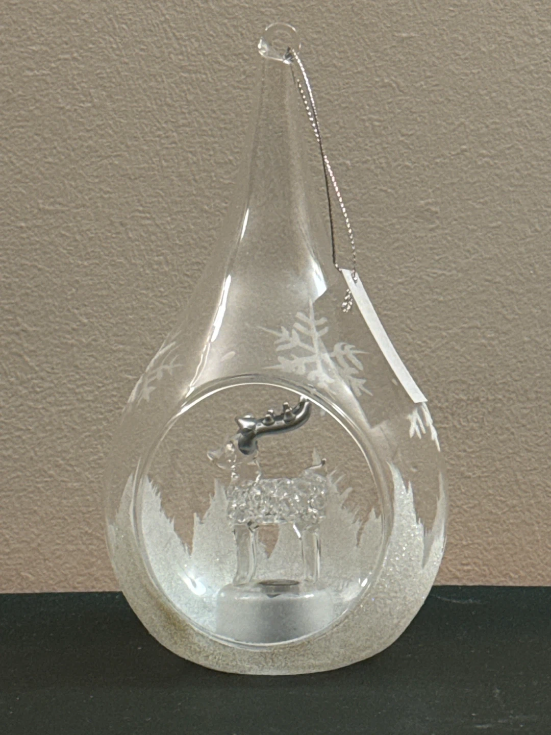 This is a clear glass teardrop ornament featuring a reindeer inside! It has a wintery scene with snowflakes and trees etched on the glass. Perfect for your holiday decor