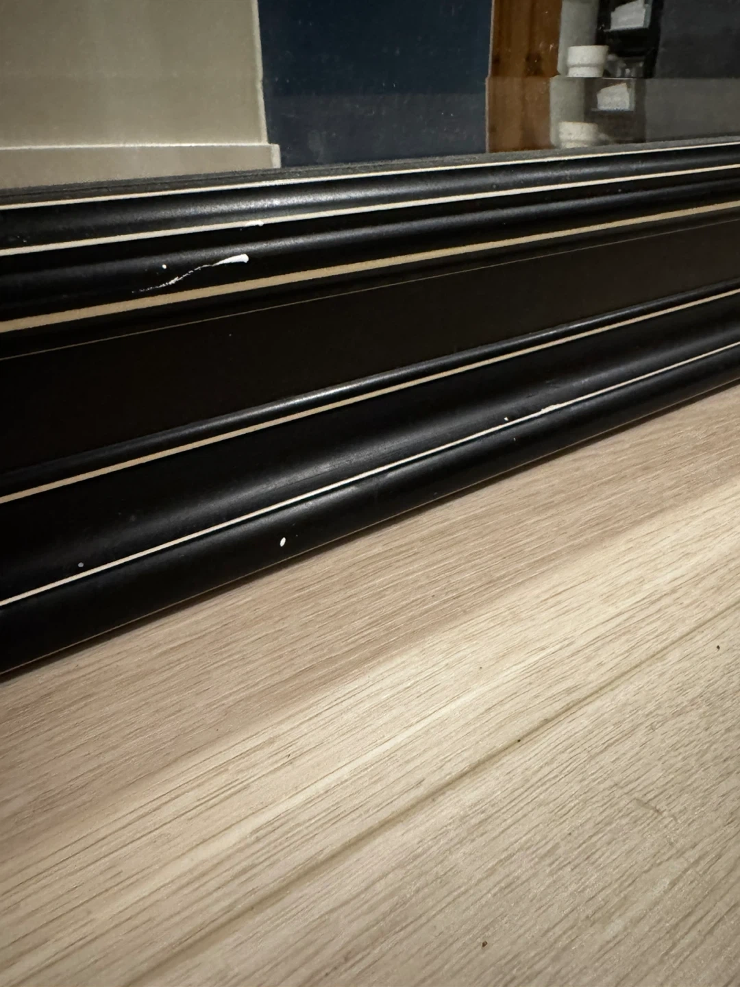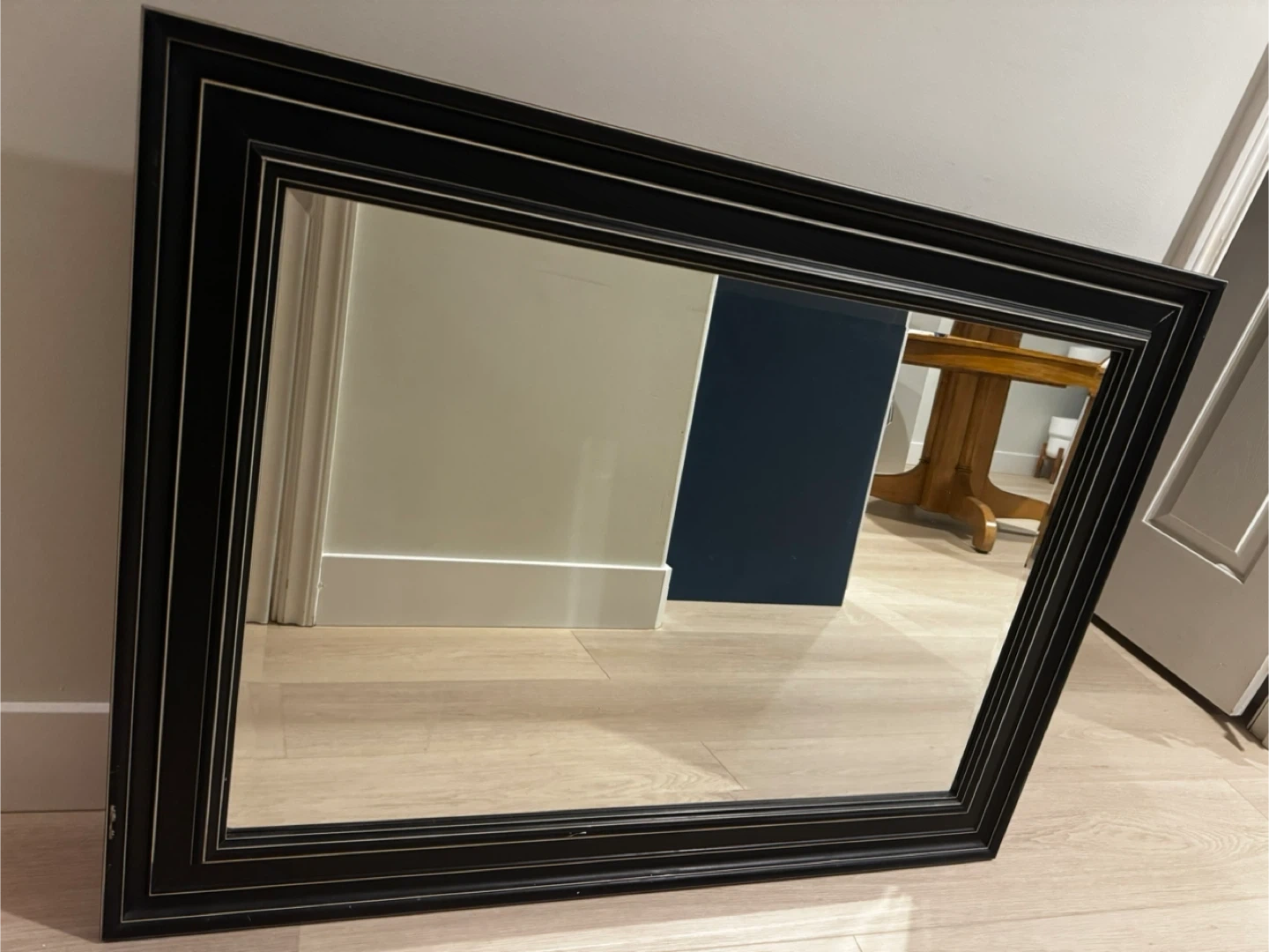 Selling a wall mirror with a black frame. It's in good condition and ready to brighten up your space!