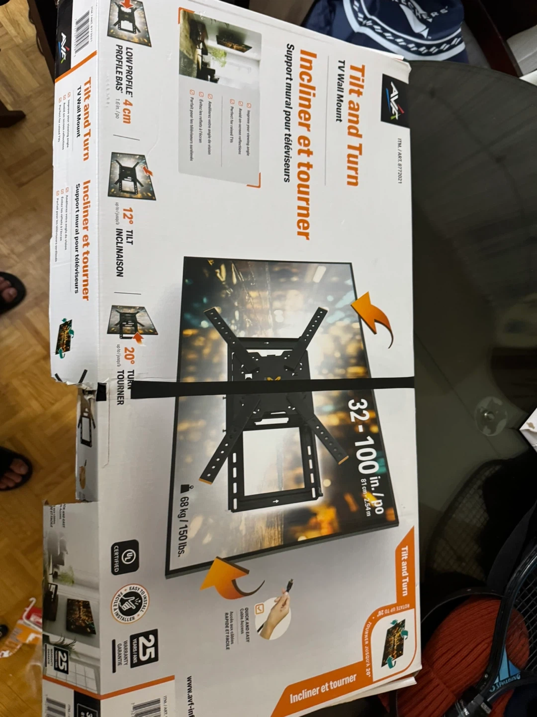 Selling an AVA Tilt and Turn TV wall mount, suitable for TVs from 32 to 100 inches. It supports a maximum weight of 68 kg or 150 lbs. The box includes all the necessary components and hardware for installation