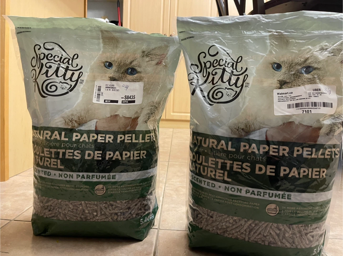 Selling 2 bags of Special Kitty Natural Paper Pellets for cats. It's unscented and made from 98.5% post-consumer recycled paper, which is great for the environment! These pellets are also 3x more absorbent than traditional clay litter.