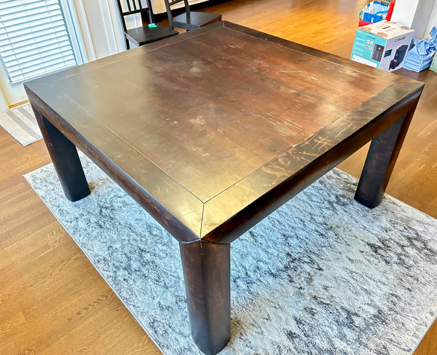 Selling a square solid wood dining table from Urban Barn. Dark finish, build is excellent, finish is fair. Love this table but it doesn’t work in our new space.