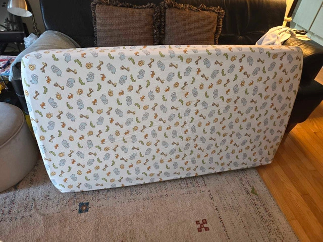 This baby crib mattress offers a safe and comfy spot for your little one to dream sweet dreams. The mattress is in excellent condition, perfect for ensuring your baby's restful sleep. Here are the details: * Standard crib size * Clean and ready to use * Easy to Clean protective plastic top layer Just remember, if the ad's still up, the mattress is still available!