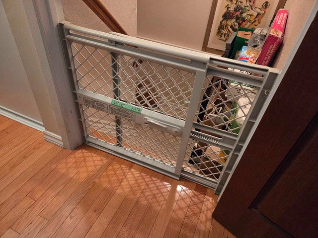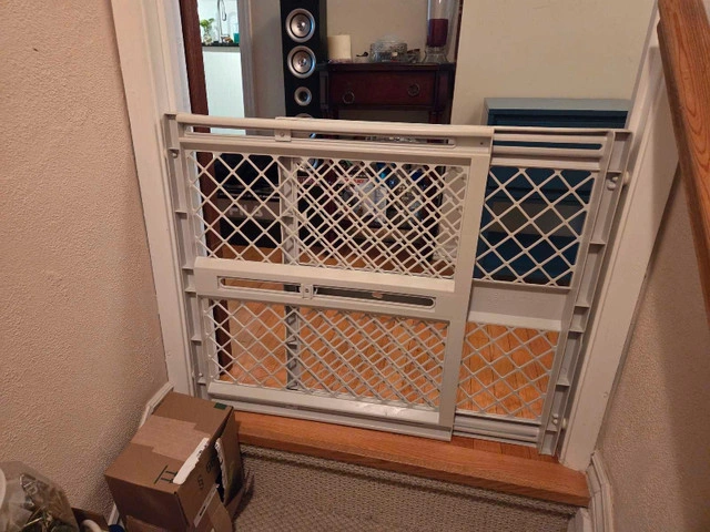 This adjustable Evenflo baby gate, designed in a neutral white, is perfect for ensuring your little one's safety around the house. It fits openings of various sizes, providing a secure barrier wherever you need it. * Adjustable width to fit different doorways and openings * Easy to install with pressure-mounted design * Durable construction for long-lasting use * Simple to operate latch This ad is live, so yes, the baby gate is still available!