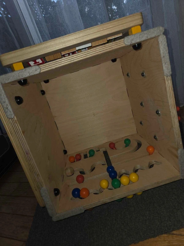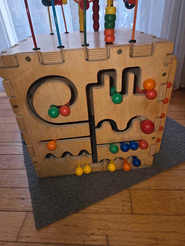 31This is a used wooden activity cube, perfect for toddlers! It features a bead maze, abacus, spinning gears, and an alphabet learning section. It's in excellent condition, ready to provide hours of fun and educational play for your little one.