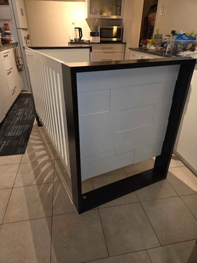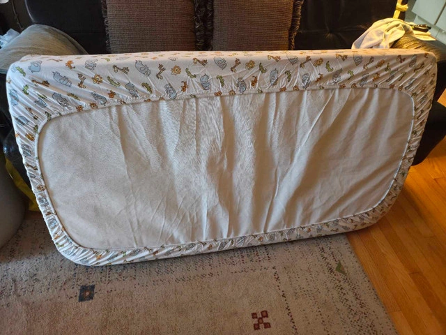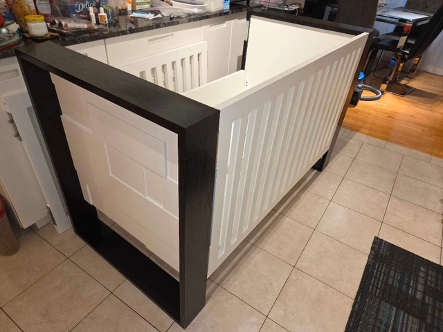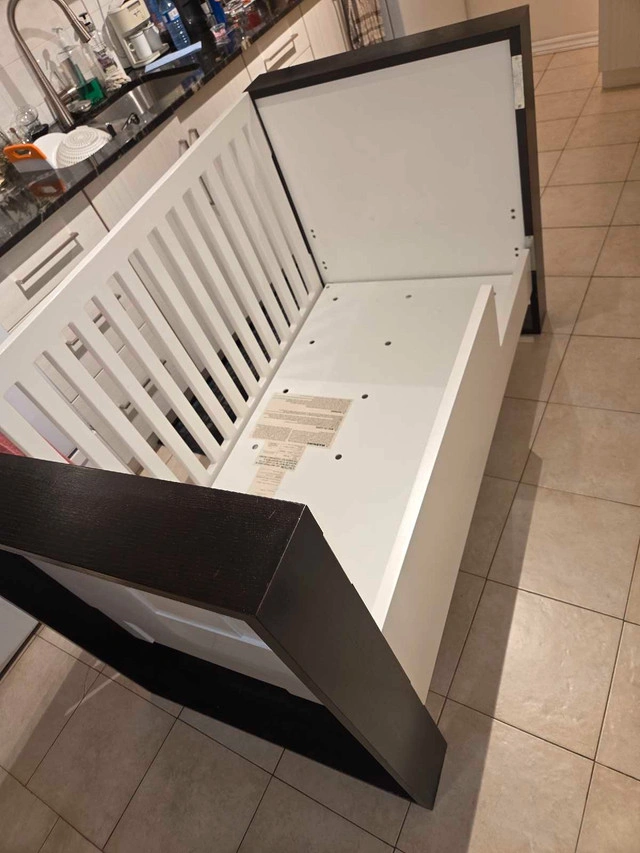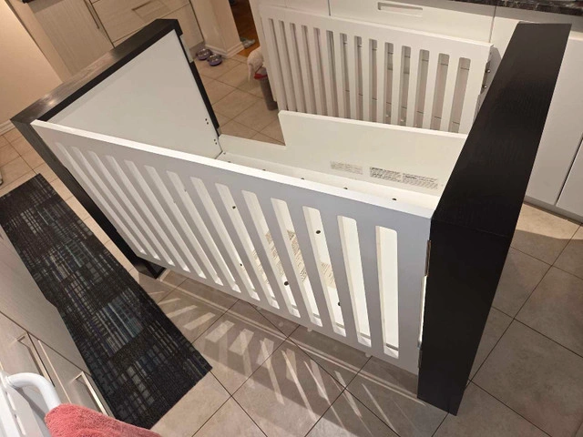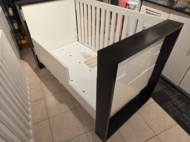 This is a Nurseryworks S1042 Aerial Crib, smartly designed to convert to a toddler bed, with decorative end panels and adjustable options. This modern crib features a white interior with black trim. The crib has been well-maintained and is in good condition, ready for your little one. Here are some additional details: * Convertible to toddler bed * Decorative end panels * Modern design Mattress is also available