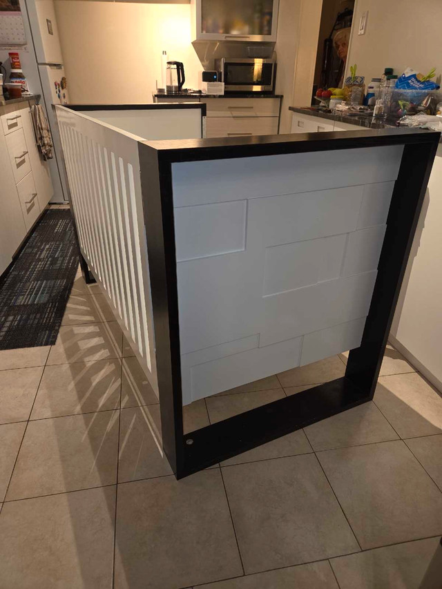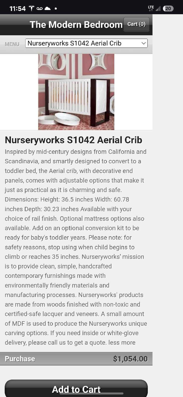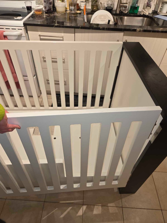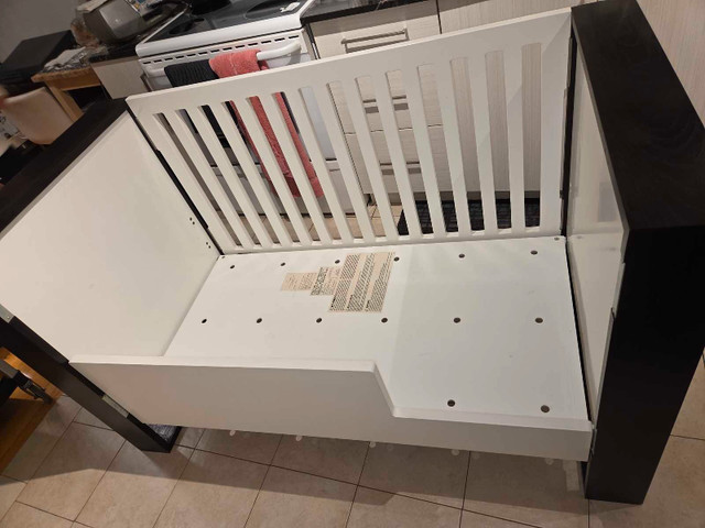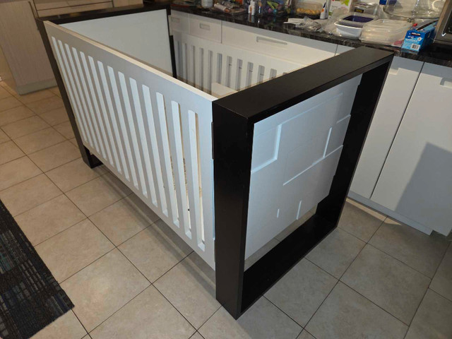 This is a Nurseryworks S1042 Aerial Crib, smartly designed to convert to a toddler bed, with decorative end panels and adjustable options. This modern crib features a white interior with black trim. The crib has been well-maintained and is in good condition, ready for your little one. Here are some additional details: * Convertible to toddler bed * Decorative end panels * Modern design Mattress is also available