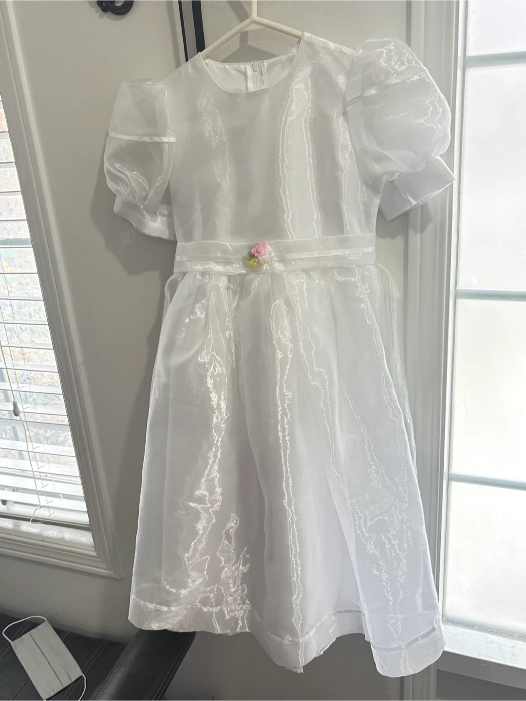 A beautiful white dress with adorable puff sleeves! The dress features a ribbon waist with a small floral detail, adding a touch of charm. Perfect for a special occasion or just feeling a little fancy!