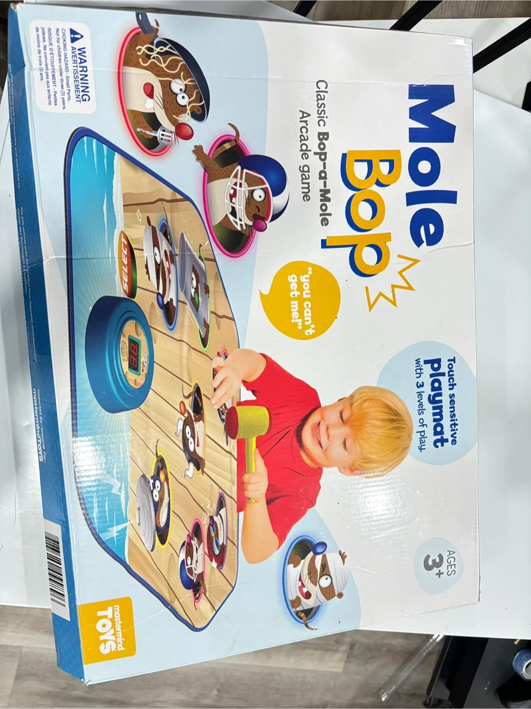 Selling a Mole Bop classic arcade game! It's a touch-sensitive playmat with 3 levels of play. Comes with a mole bop playmat, mallet, and instructions. Suitable for ages 3+!