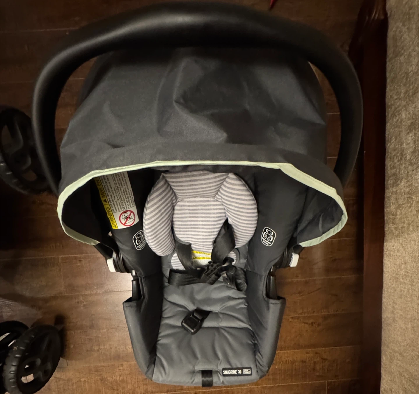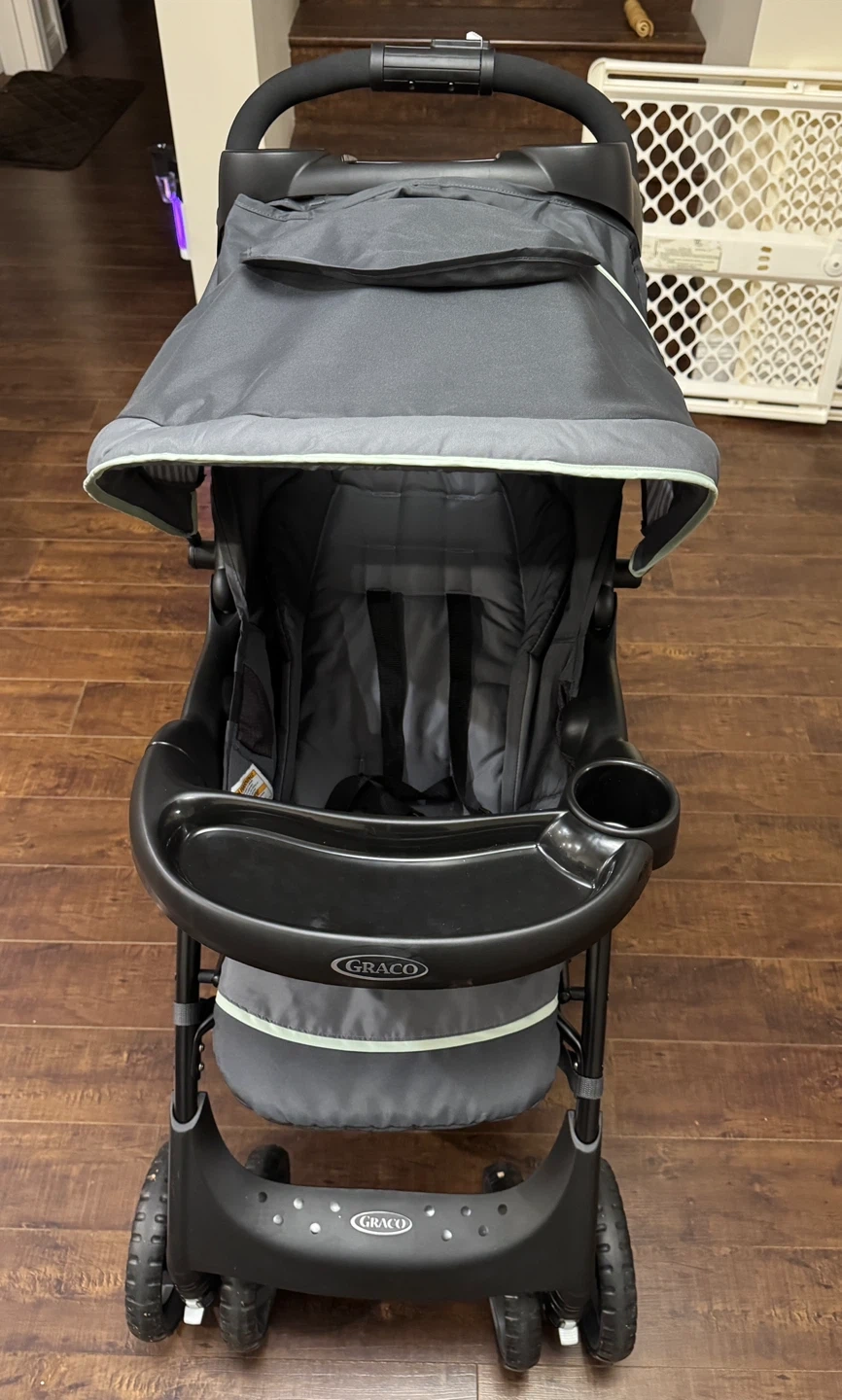 Selling a Graco stroller that's in brand new condition! It features a grey colour scheme with a striped pattern inside the hood.