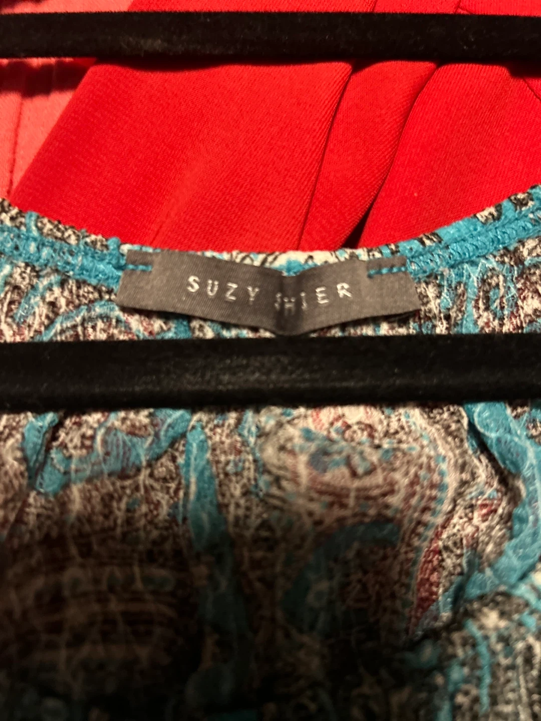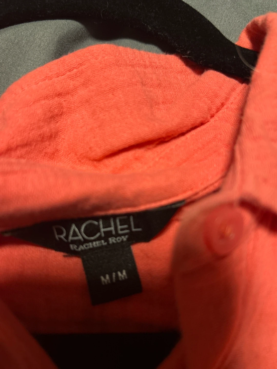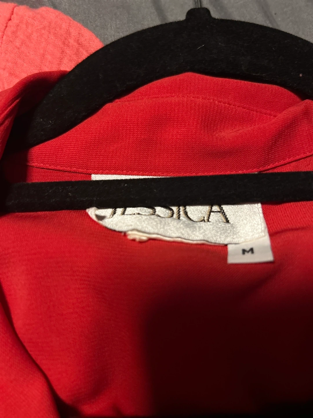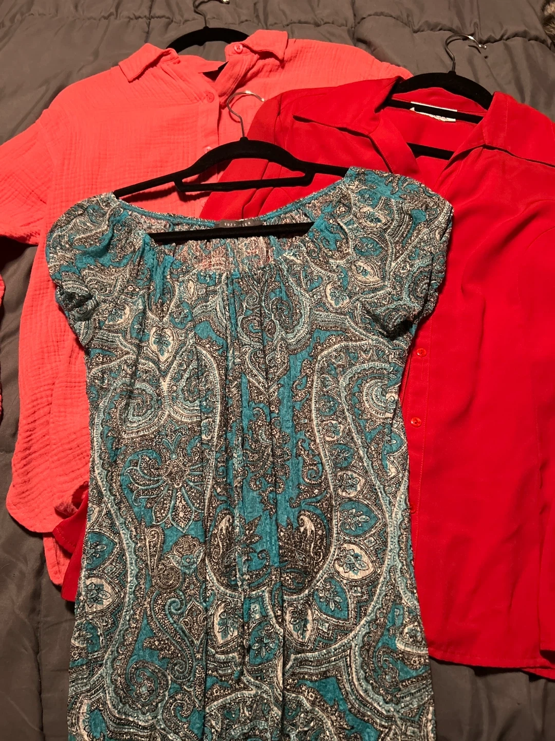 Selling a lot of three women's tops, all in size medium. Includes a coral top from Rachel Roy, a red top from Jessica, and a patterned top from Suzy Shier. All in good condition!