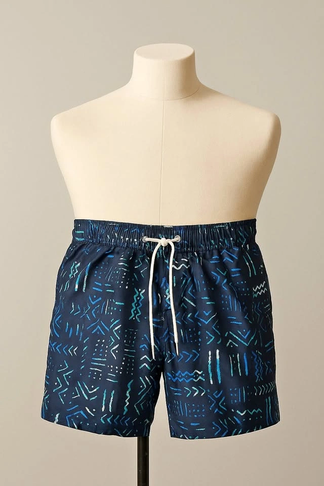 60Navy blue Hollister men’s swim shorts featuring a bold geometric pattern in teal and blue tones. Lightweight, quick-dry fabric with elastic waistband, drawstring tie, and mesh lining for comfort. Excellent condition, perfect for beach days or the pool.