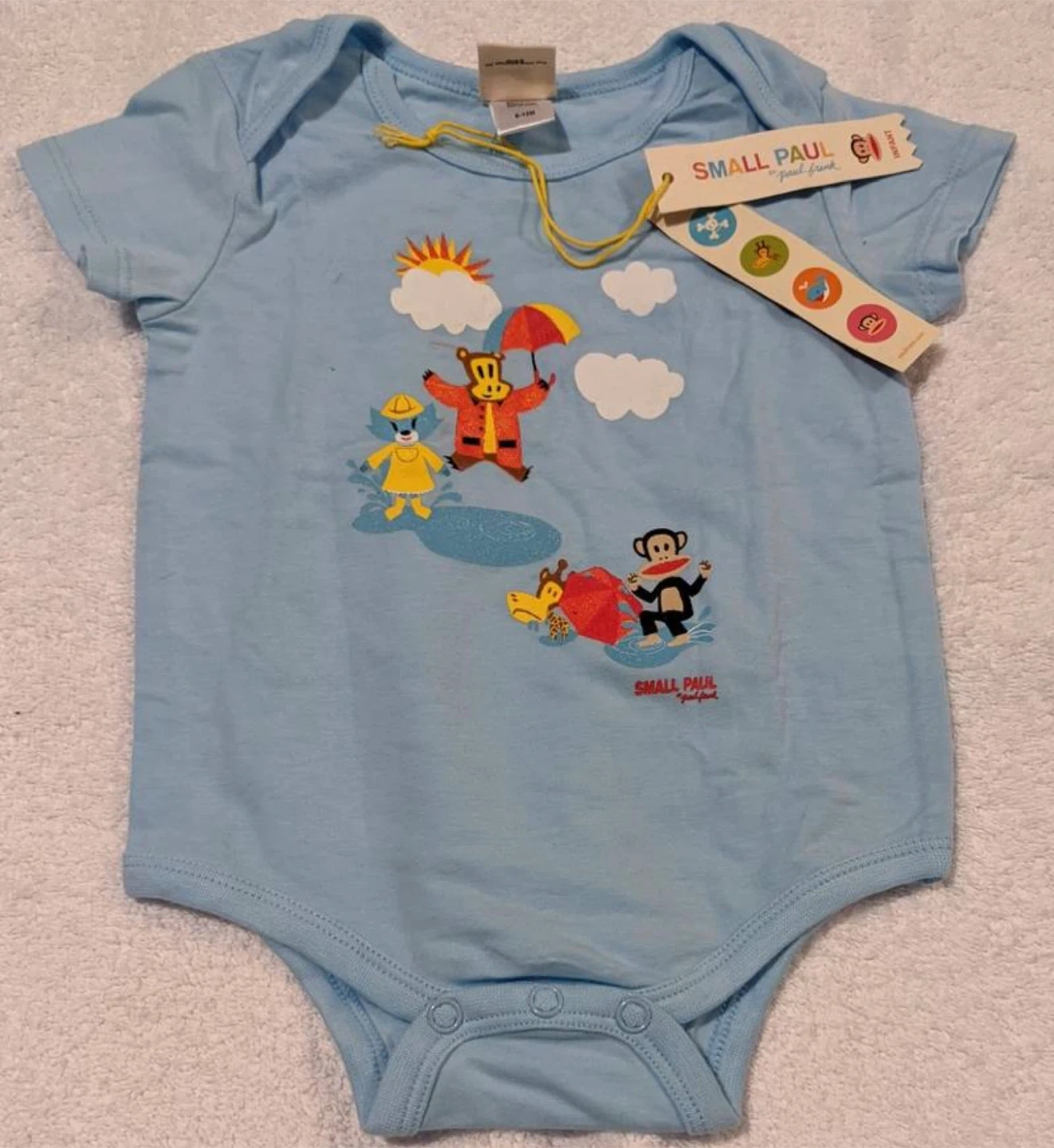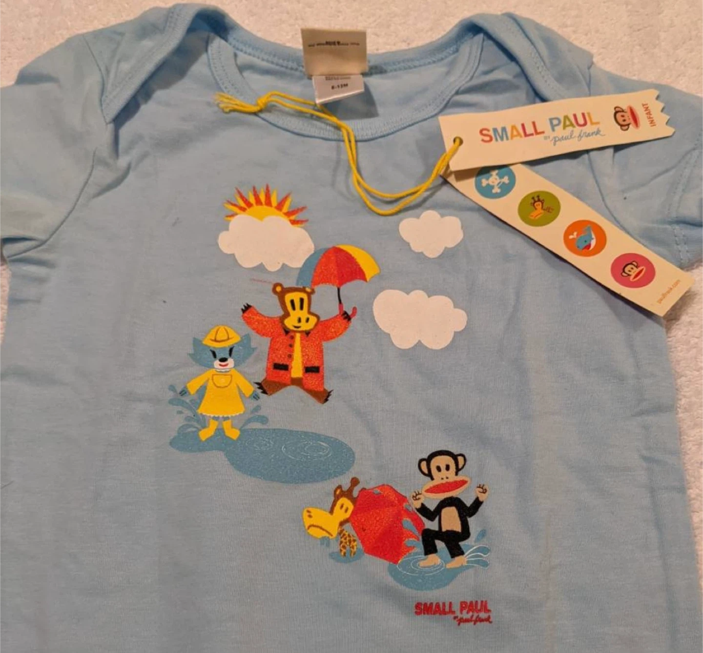Adorable Small Paul by Paul Frank infant onesie! It's in excellent condition and perfect for your little one. Size is 6-12 months. The light blue colour is so cute!
