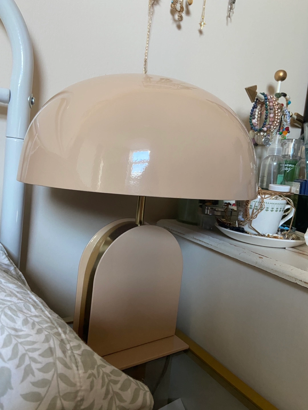 Selling a cute retro style metal lamp! It's in great condition. The lamp has a beige colour, gold accents and a unique mid century modern style. Purchased new for $70 in 2023 and minimally used.