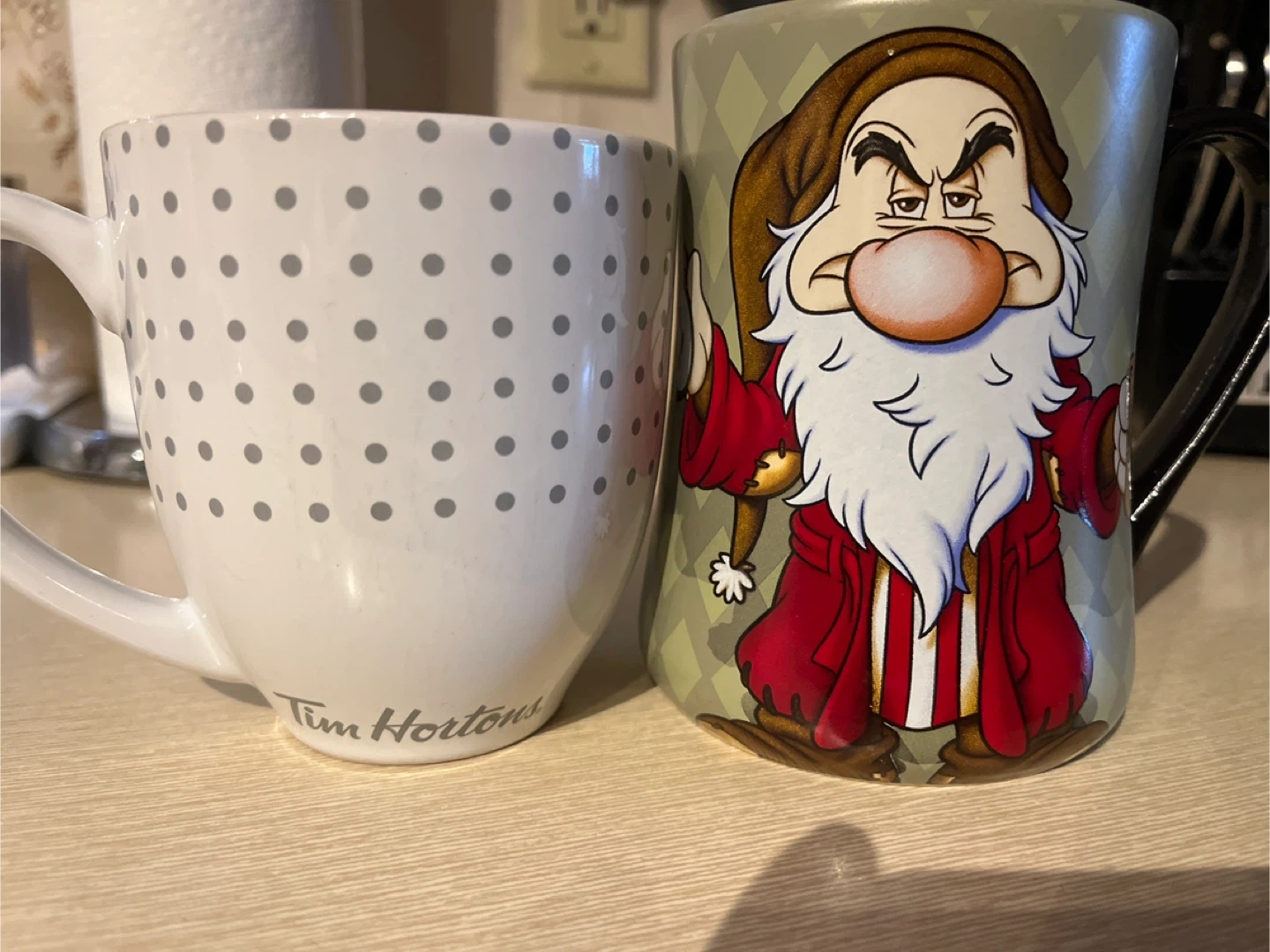 Selling two mugs! One is a Tim Hortons mug with a cute polka dot design. The other one features Grumpy from Snow White and the Seven Dwarfs, and it says "I HATE Mornings!"