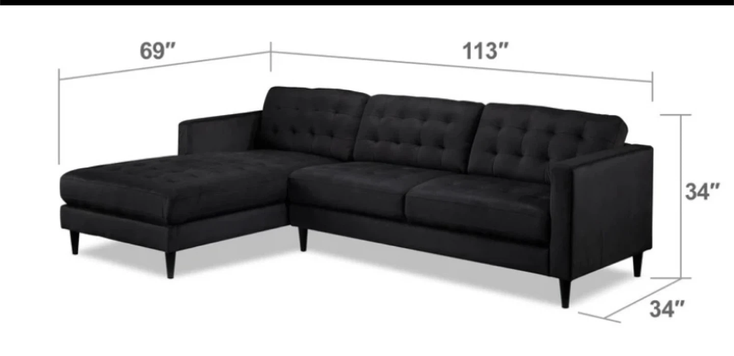 Selling a comfy black sectional sofa! It's in great shape and ready for a new home. The dimensions are 113 inches by 69 inches, with a height of 34 inches. Perfect for lounging and adding a touch of style to your living space