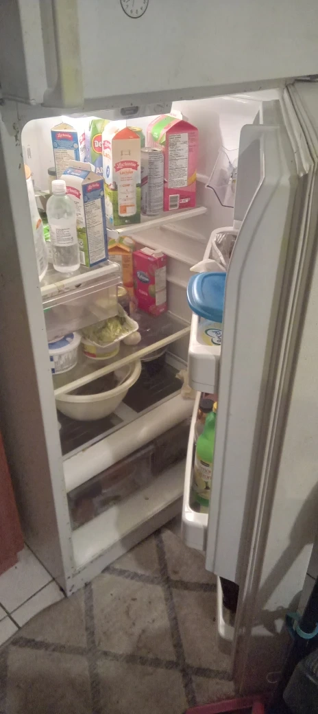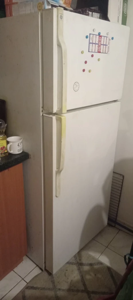 Selling a white GE refrigerator. It's a top-freezer model, perfect for a small family or apartment. It has some signs of use, but it's still functional and ready to keep your food cold!