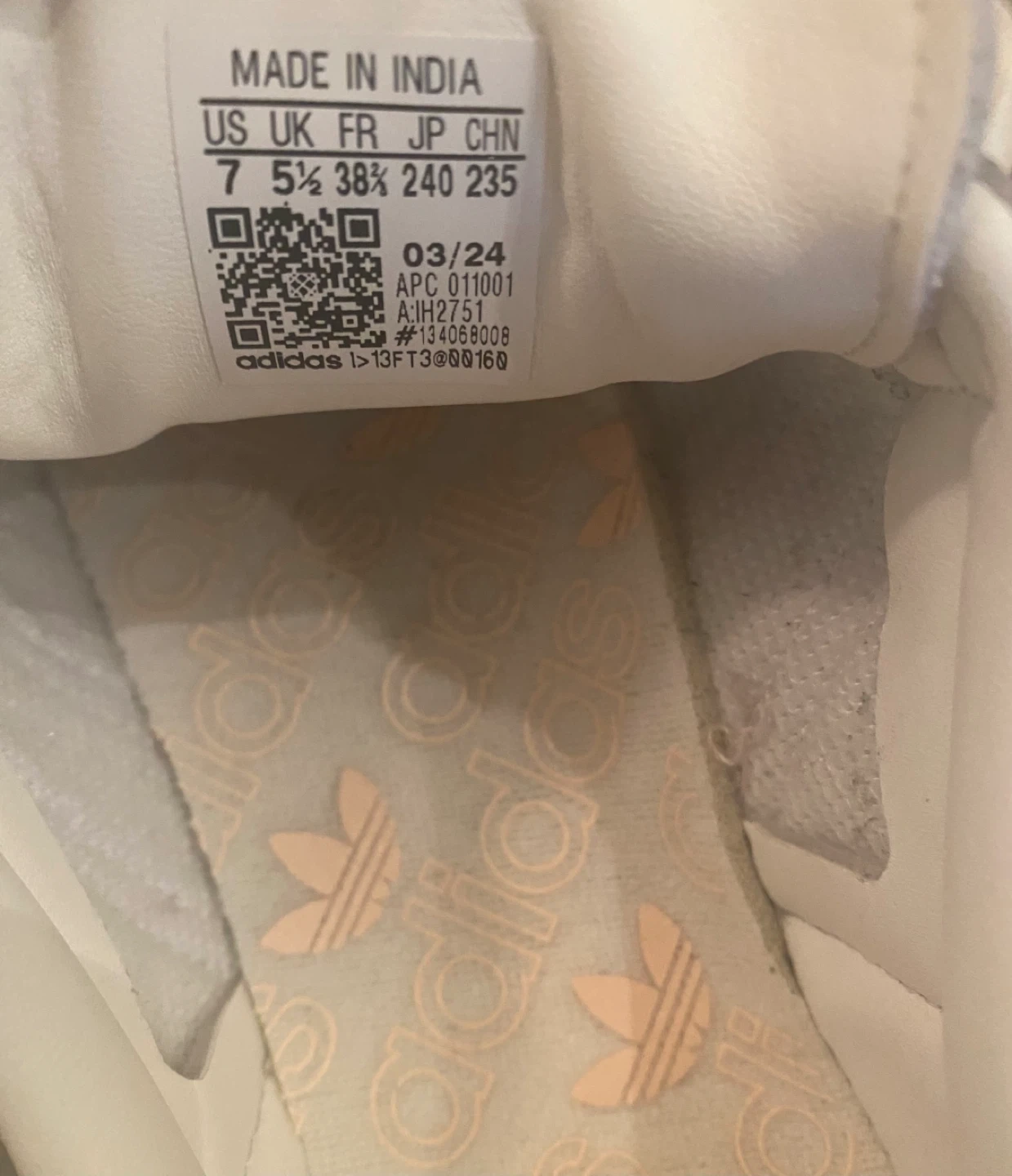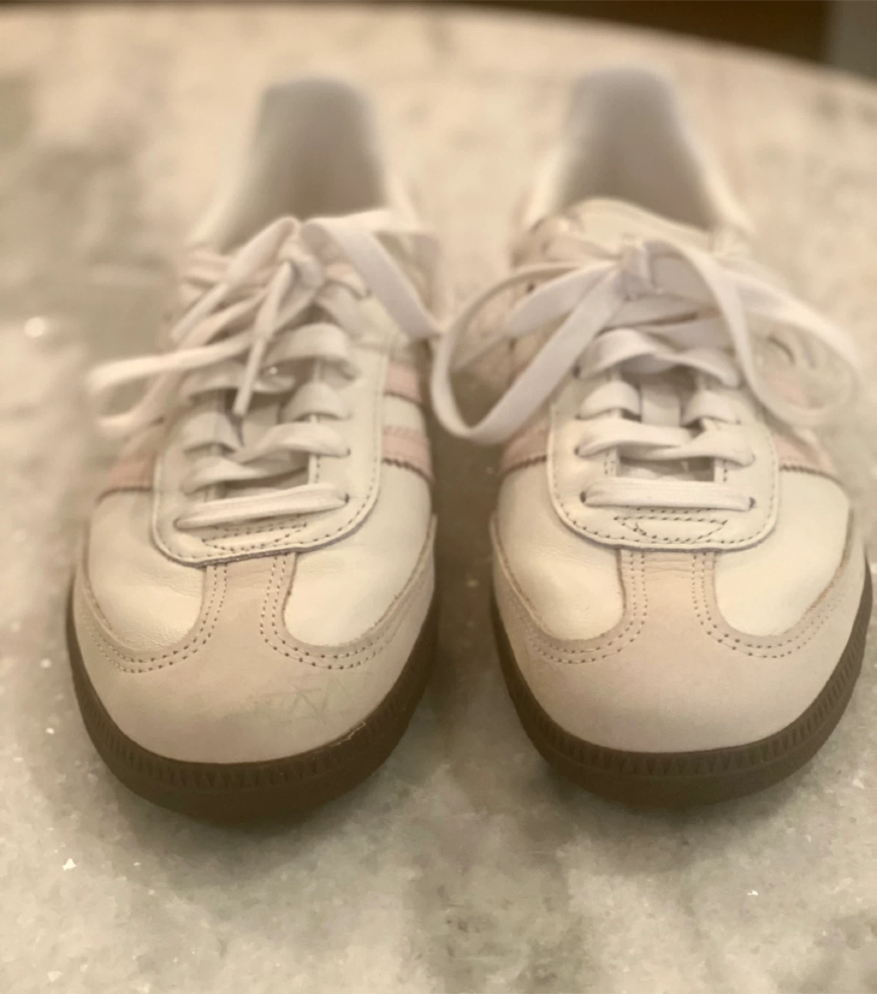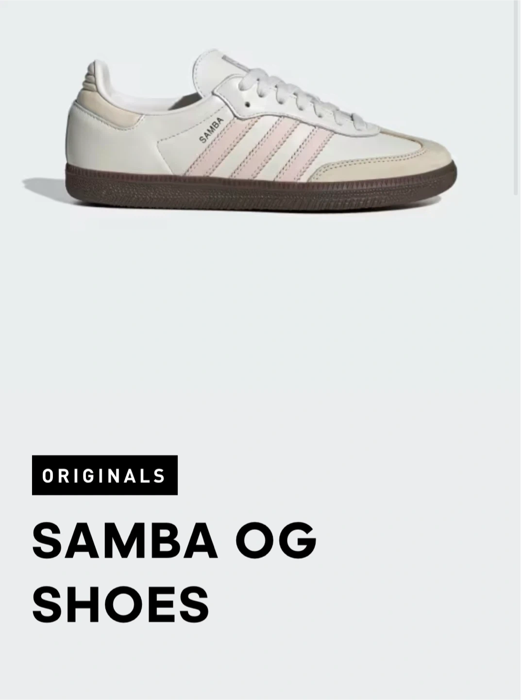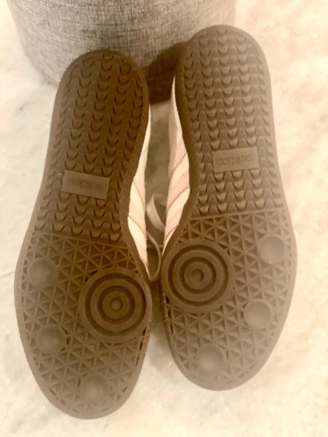 Selling a pair of Adidas Samba OG shoes. They're a size US 7. The colour is a lovely off-white with pink stripes. Great for casual wear or sports!
