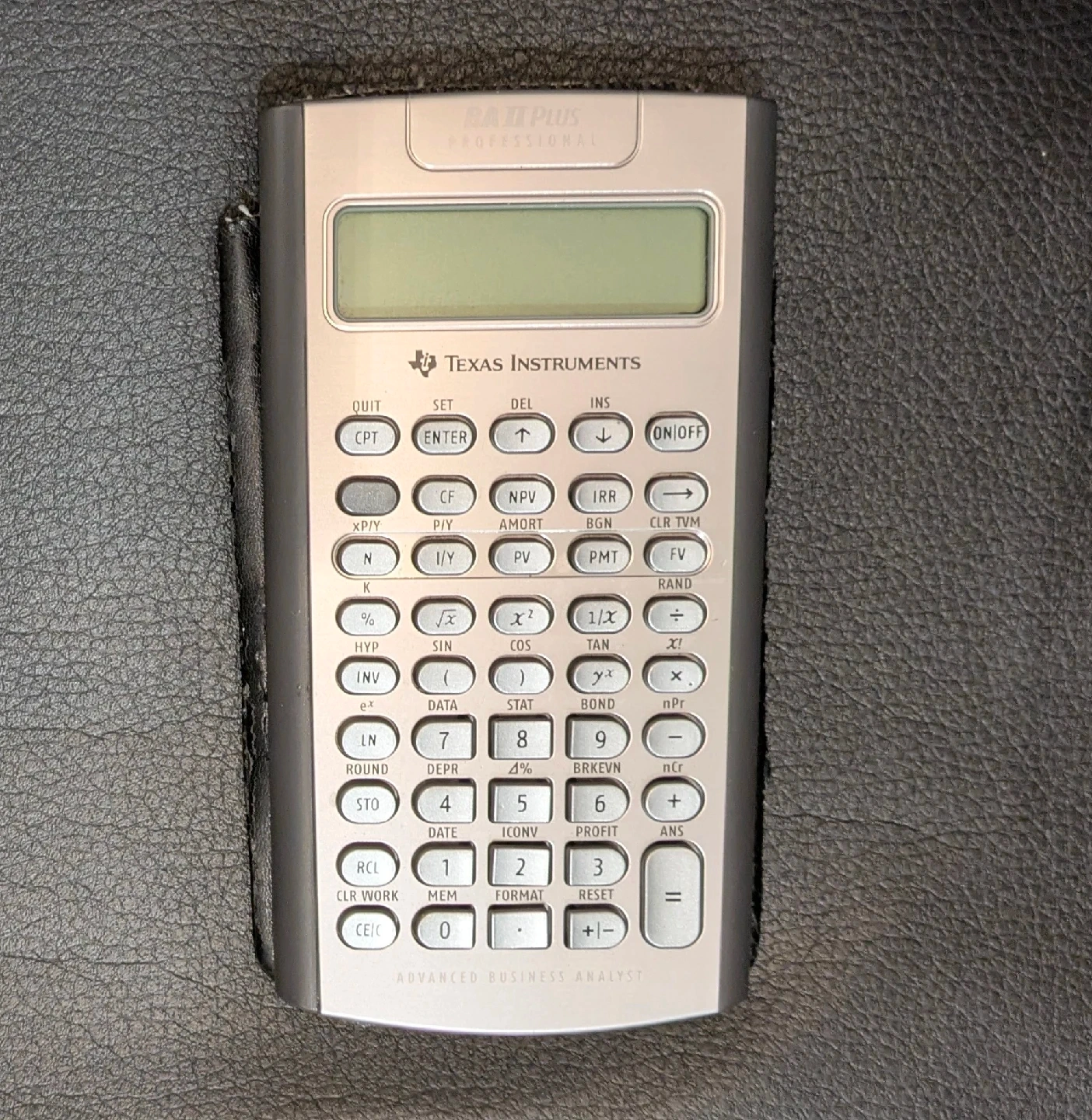 57Selling a Texas Instruments BA II Plus professional financial calculator. It's in excellent working condition. Comes with cover. Great for actuary, business, financial courses. See my other listings for more calculators. Pick Up Markham - can arrange for exact location.