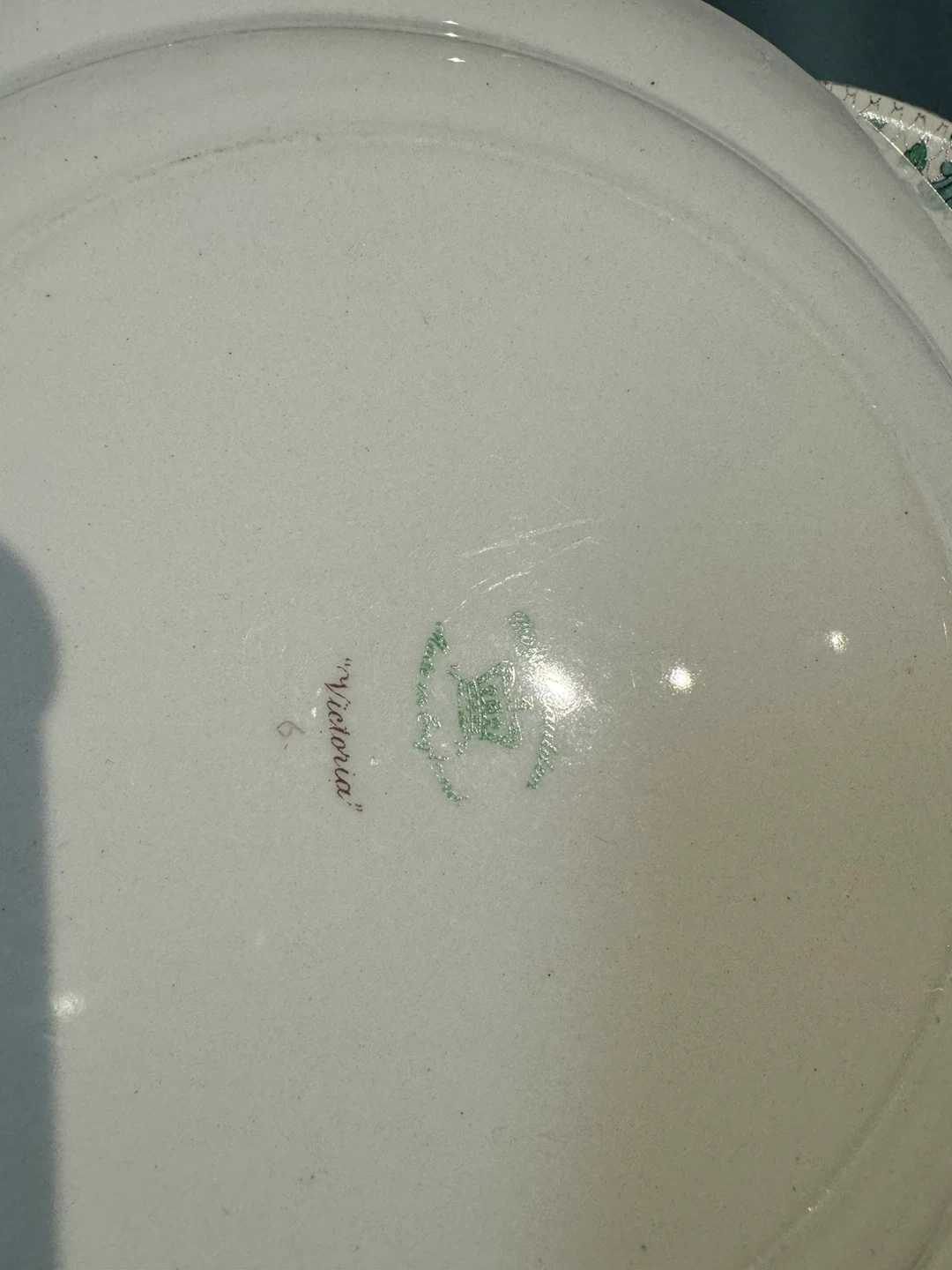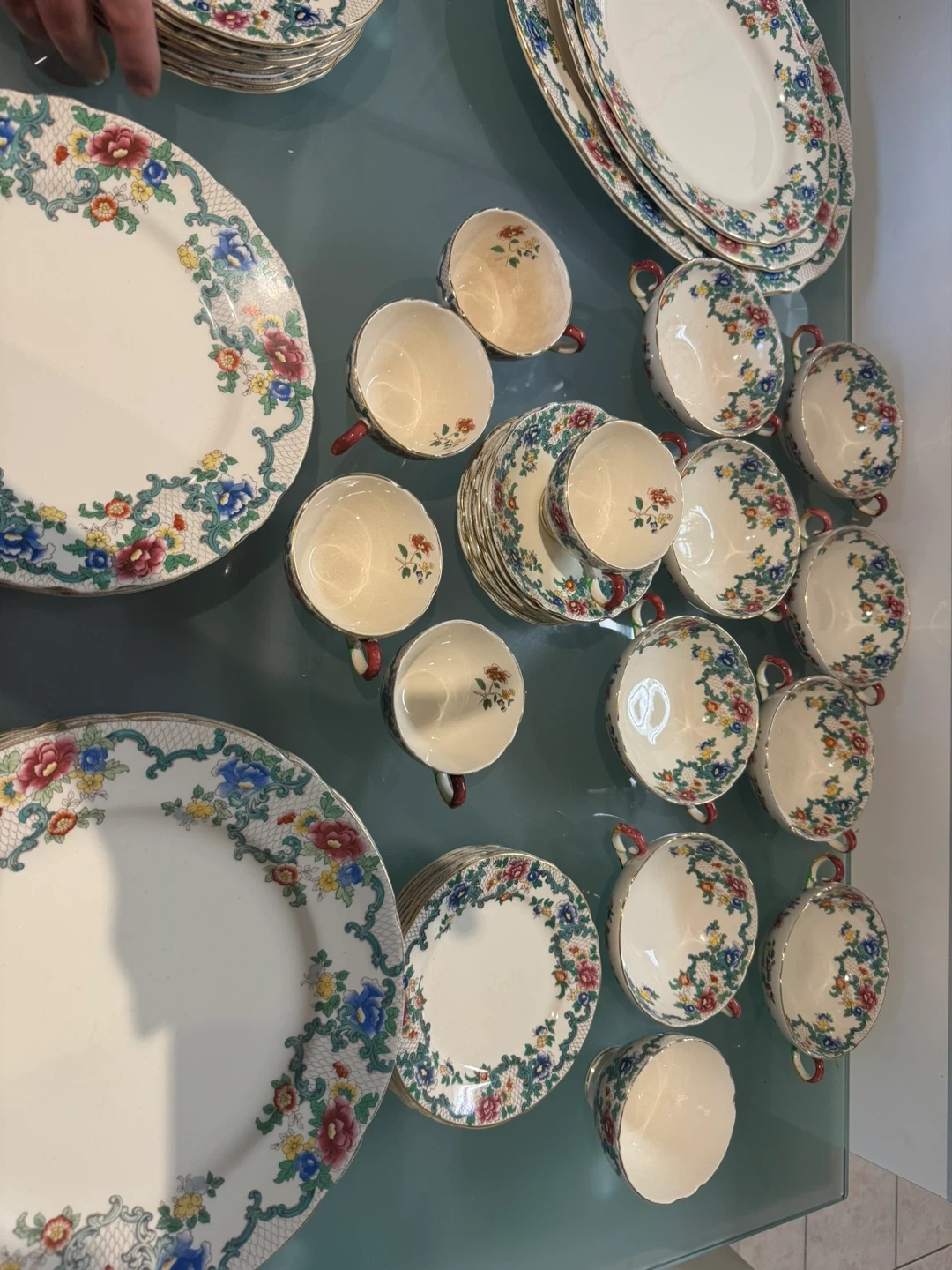 This is a complete set of fine bone china Victoria china. This set is used, but in good condition. It includes dinner plates, salad plates, bowls, cups, and saucers. *plater:3 * Dinner Plates: 8 * Salad Plates: 8 * Bowls: 8 * Cups: 5 * Saucers: 9 *plates:6 This dinnerware set is perfect for special occasions or everyday use. The intricate floral des