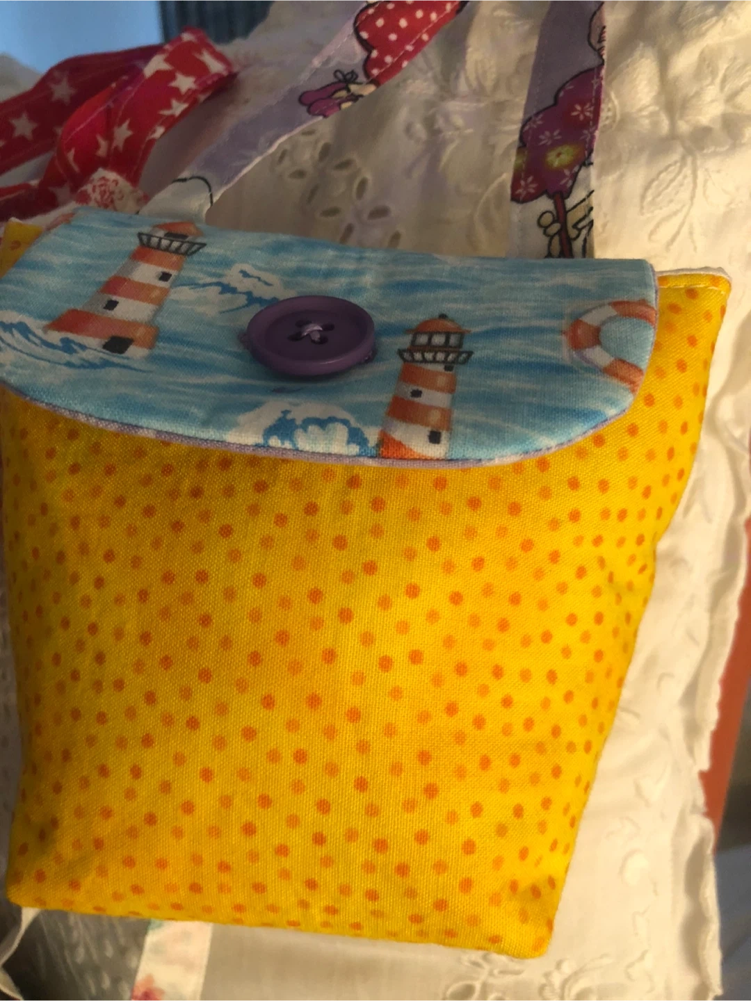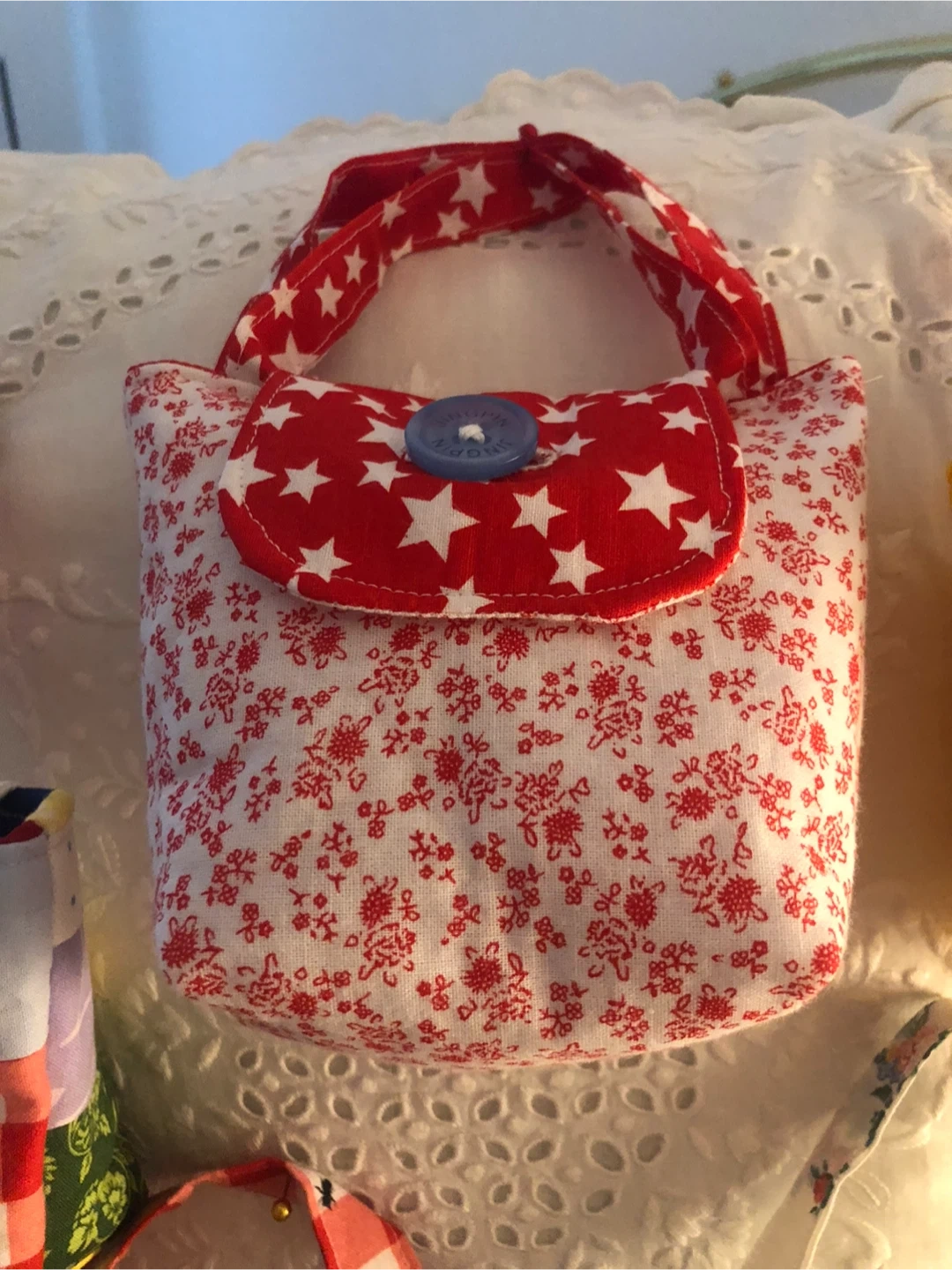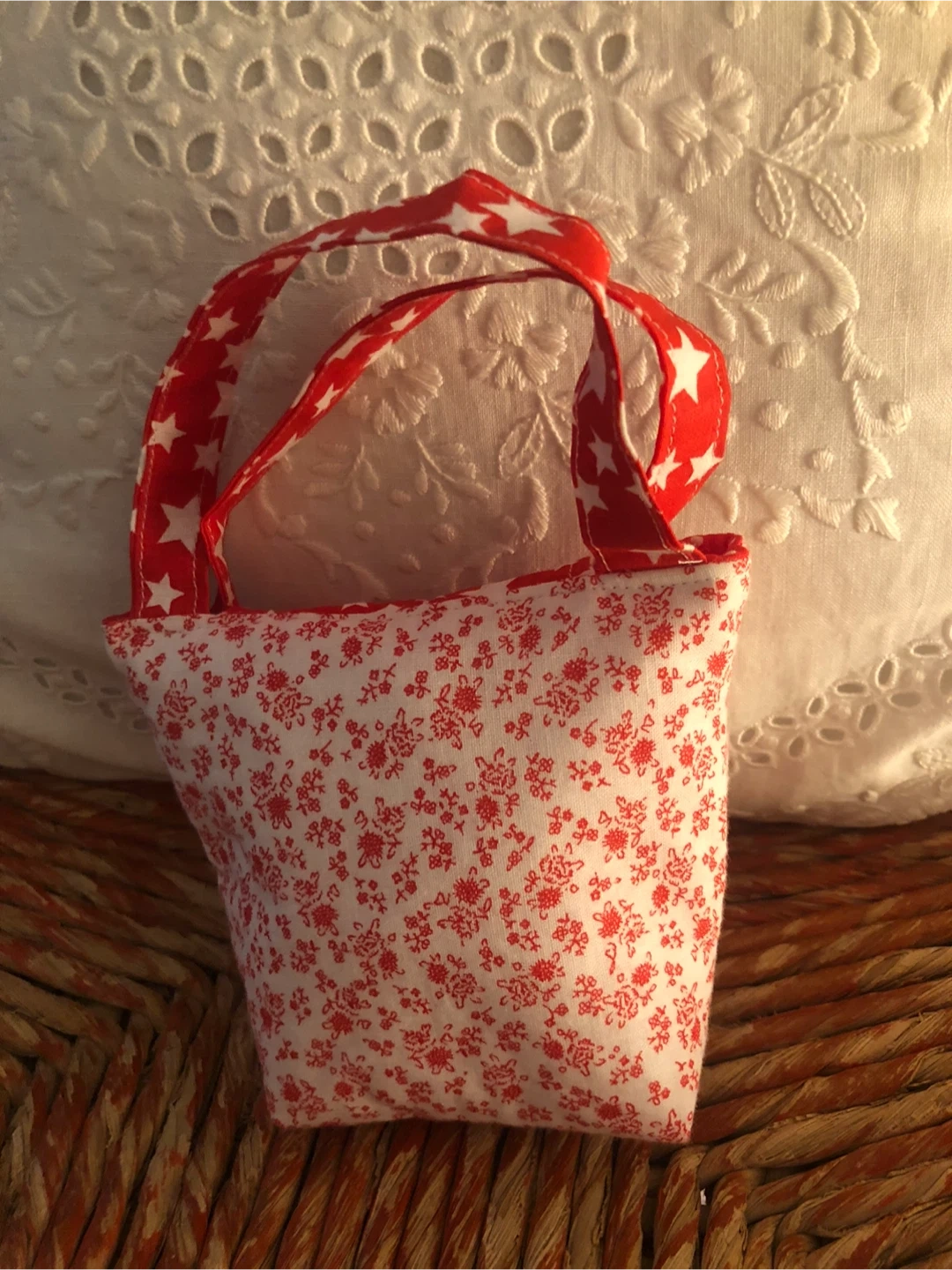 71Check out these adorable handmade mini tote bags! Each one is unique with different fabric patterns and colours. Perfect for the little ones in your life. Patchwork. Height 5” $8. Each Cotton Xmas is coming. Lovely gift .
