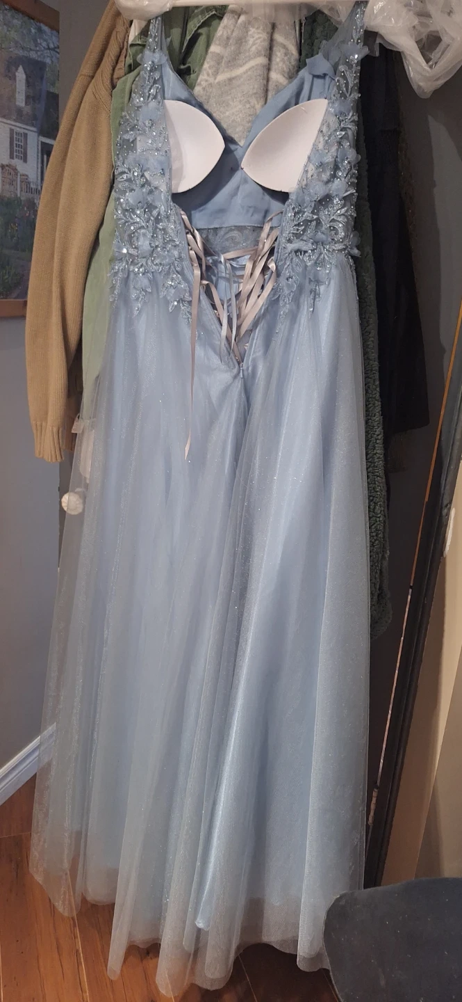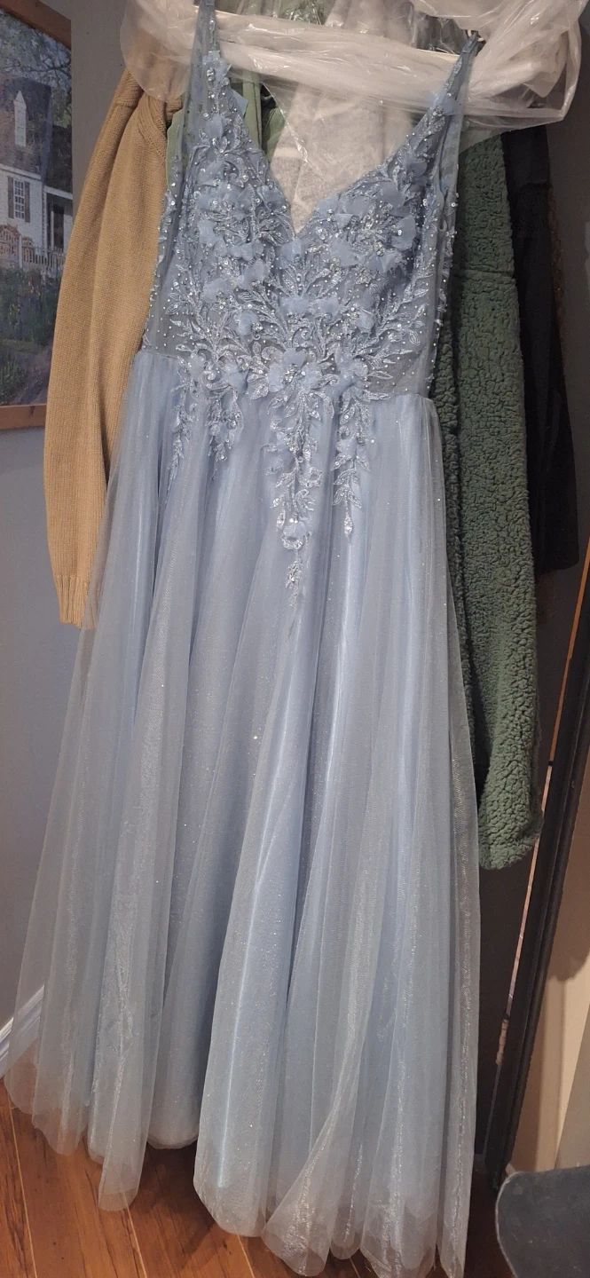 Beautiful blue prom dress! It features delicate floral appliques and a flattering silhouette. Perfect for a special occasion! Has has some past tailoring work done on it but an easy fix!