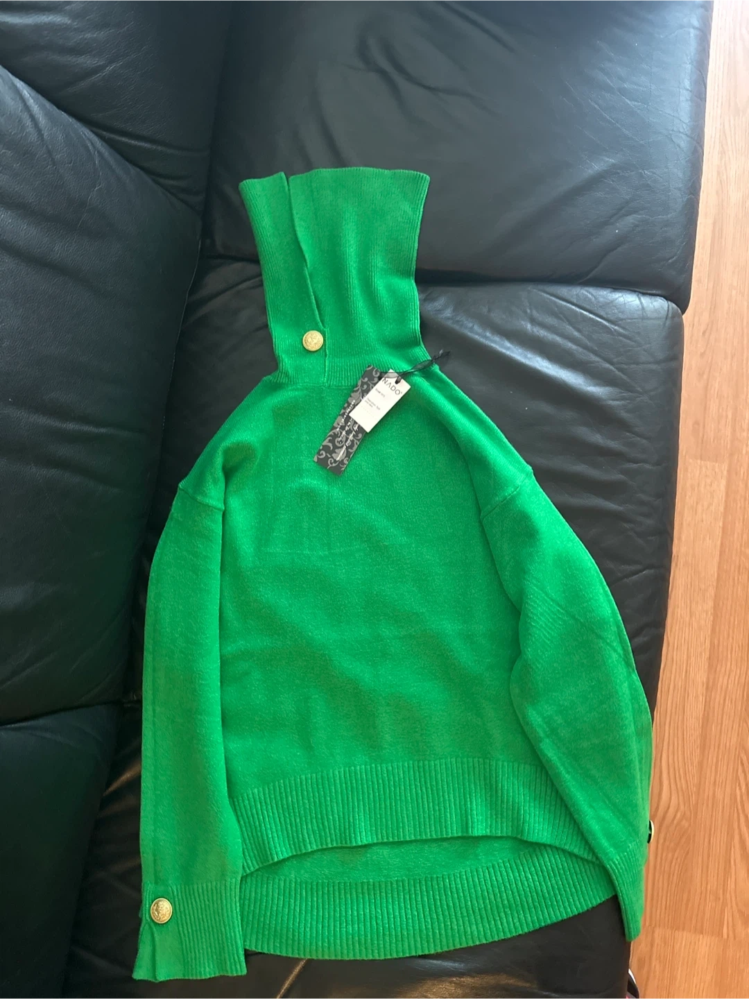 Selling a vibrant green turtleneck sweater from Nado! It features stylish gold button accents on the collar and cuffs. Perfect for adding a pop of colour to your wardrobe