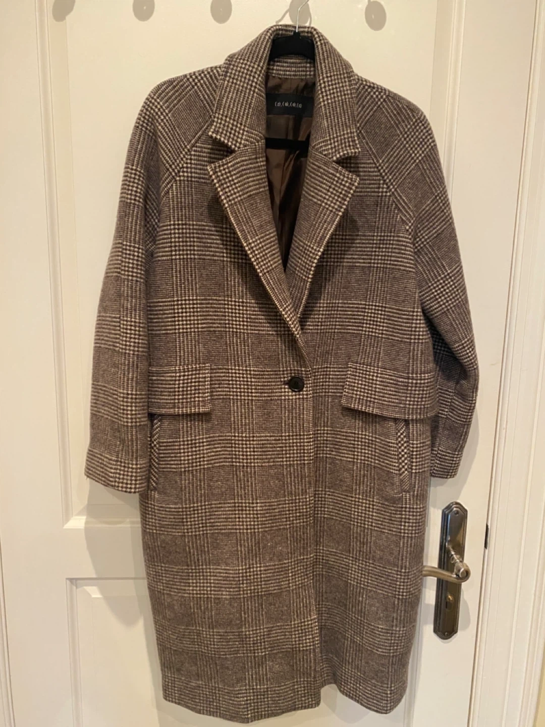 Here's a stylish brown plaid coat! It's in great condition and perfect for adding a touch of classic style to your wardrobe. It features a timeless plaid pattern and a flattering cut.