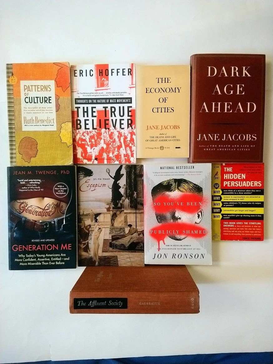 Location: Yonge and College /downtown Toronto $6 each. Cash only; prices are firm. - Patterns of Culture - Ruth Benedict - The True Believer: Thoughts on the Nature of Mass Movements - Eric Hoffer - The Economy of Cities - Jane Jacobs - Dark Age Ahead - Jane Jacobs - Generation Me - Jean M. Twenge - Escapism - Yi-Fu Than - So You've Been Publicly Shamed - Jon Ronson - The Hidden Persuaders - Vance Packard - $5 - The Affluent Society - John Kenneth Galbraith Feel free to check out my other book posts as well!