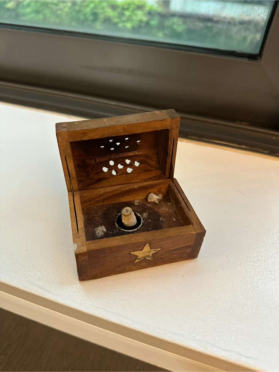 Selling a cute wooden incense burner box. It has a star design on the front and decorative cutouts on the top. Perfect for adding a touch of zen to your space!