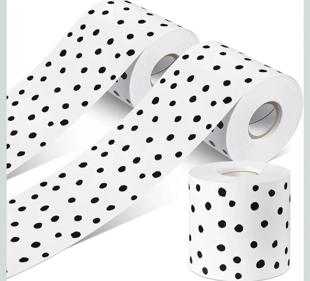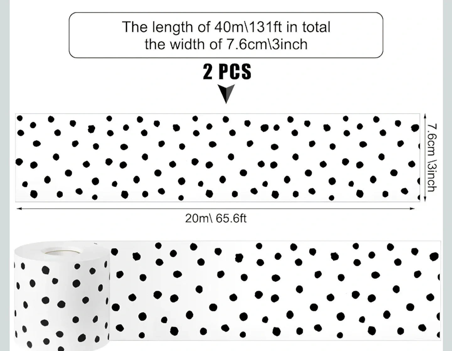 70This Perkcop border trim is perfect for adding a fun touch to any space! It features a cute polka dot design on a white background. The roll is easy to store and access, and you can cut it to the size you need with scissors. The length is 40m (131ft) in total, and the width is 7.6cm (3 inches). New.