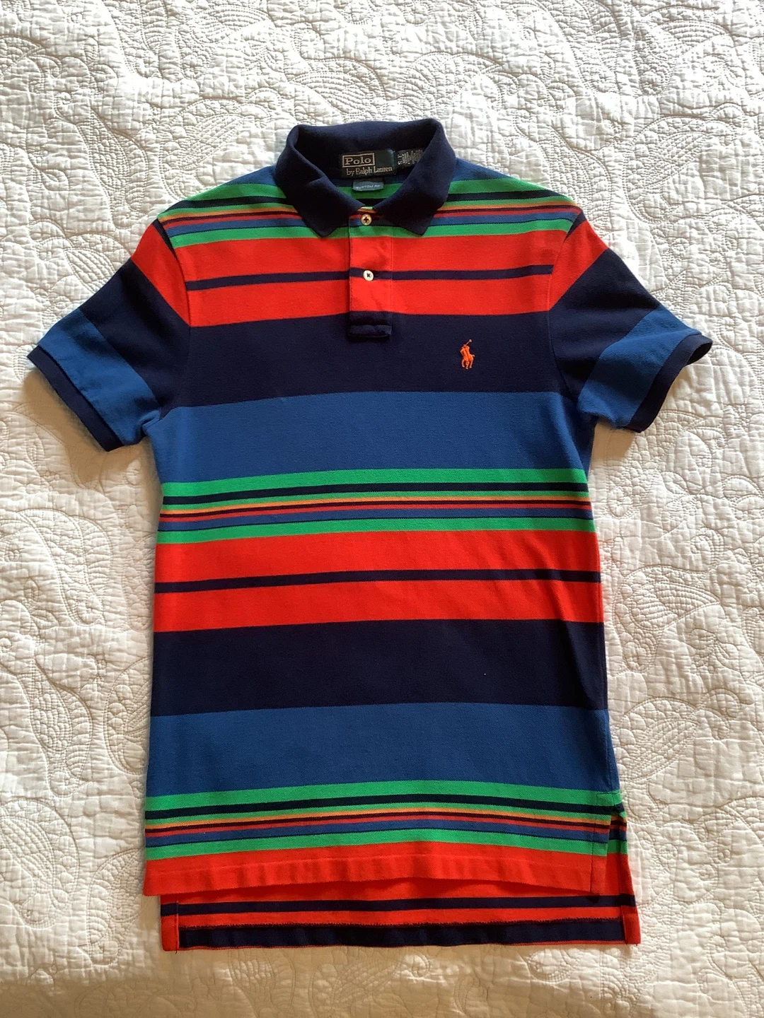 Selling a Polo by Ralph Lauren polo shirt in size small! It features a colourful striped design and a custom fit. Perfect for adding a pop of colour to your wardrobe. Worn once.