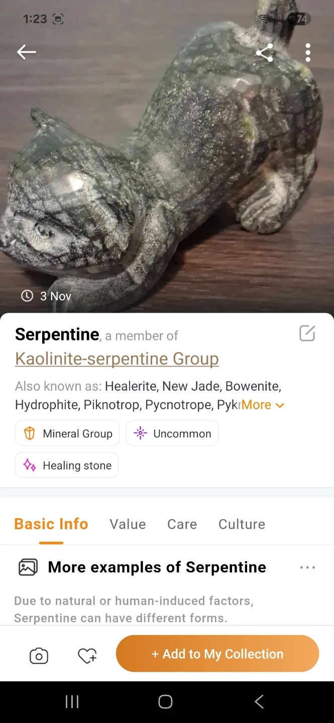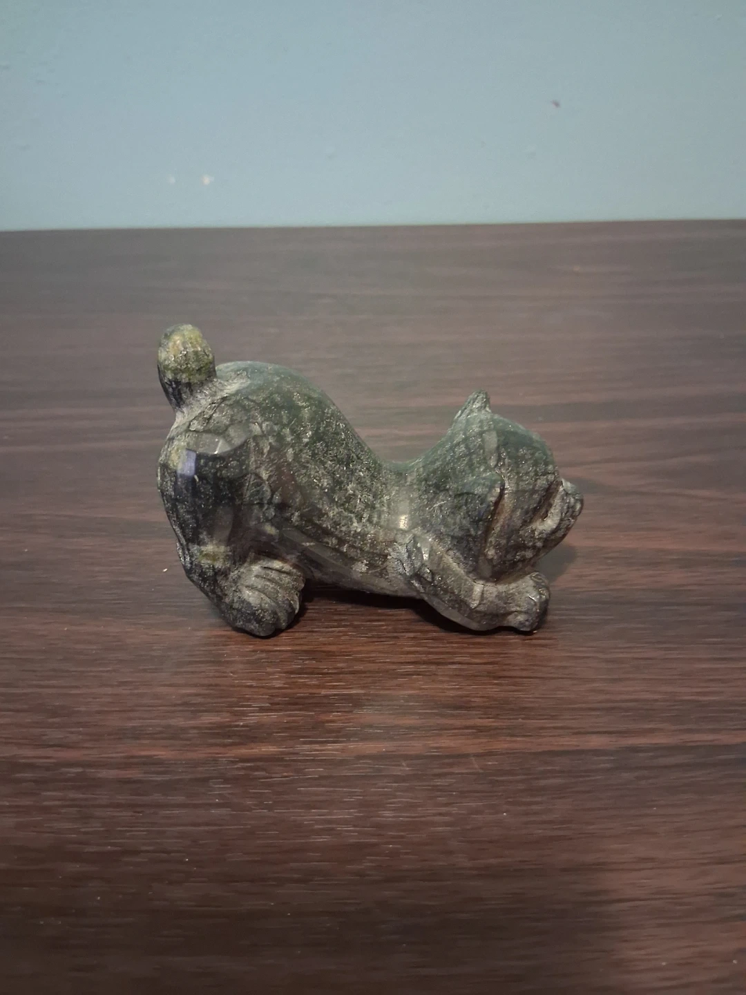 549Serpentine cat figurine, a member of the Mineral Group. Also known as Healerite, New Jade, Bowenite, Hydrophite, Piknotrop, and Pyknotrope. This is considered a healing stone and is uncommon