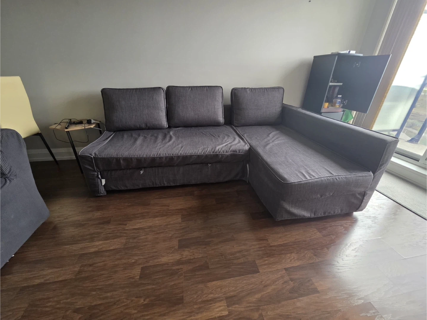 Selling a grey Ikea Friheten sleeper sofa! It's in great shape and easily converts into a bed, making it perfect for guests or small spaces. Plus, it has built-in storage underneath for blankets and pillows! It's a super functional and comfy. Comes with grey cover for the whole sofa & pillows