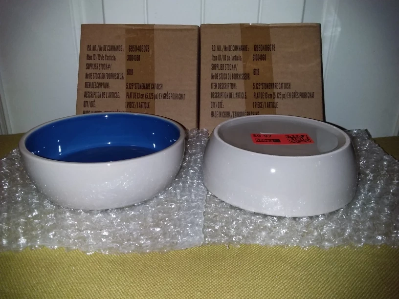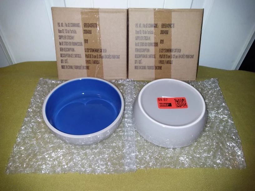 5.125" x 2" stoneware cat dishes, still in their original boxes! Blue interior / grey exterior. They're the perfect size for your furry friend's food or water π¦ πΊ