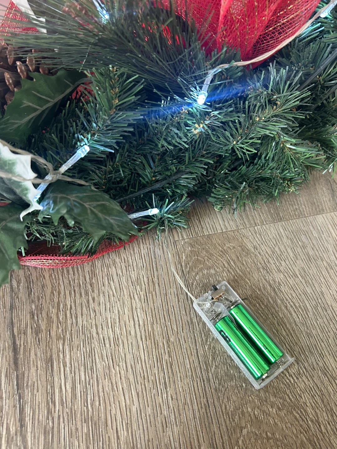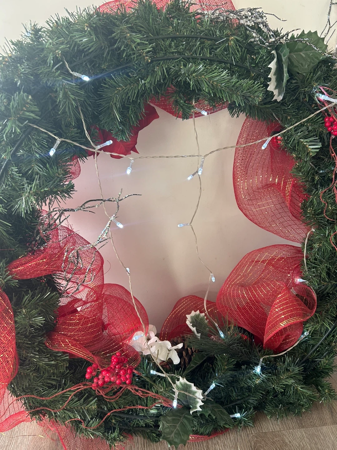 a festive Christmas wreath! It features a mix of red and green decorations, including poinsettias, pinecones, and a cute Santa ornament. Perfect for adding some holiday cheer to your home!