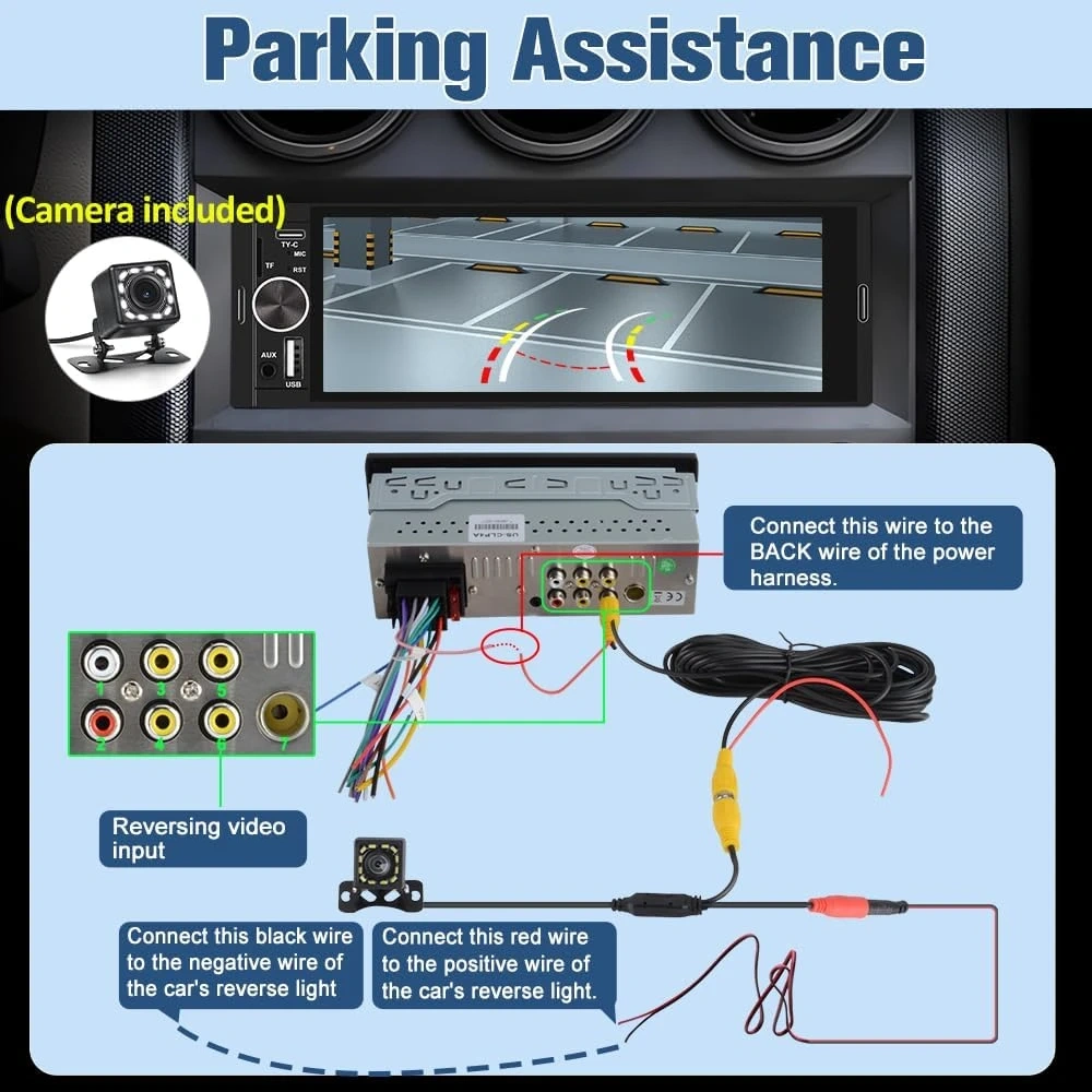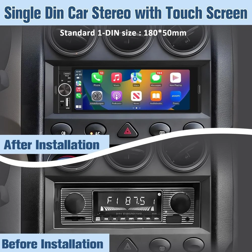 754Single Din Car Stereo with IPS Touchscreen, Wireless CarPlay & Android Auto, Bluetooth Car Radio with Backup Camera, External Mic, SWC, FM, USB, and TF Support, Brand New in the Box/Sealed Features: 【Universal Single DIN Touchscreen Car Stereo】 This single din touchscreen radio features a high-resolution display, designed to fit most vehicles with a standard single DIN radio slot (180 x 50 mm). Its compact build ensures a seamless dashboard installation. Please note: use the included power adapter during installation to prevent battery drain or other electrical issues. 【Wireless CarPlay & Android Auto Head Unit】 Enjoy safer, smarter driving with this wireless CarPlay and Android Auto head unit. Whether connected via Bluetooth or USB, you can effortlessly access navigation, music, calls, and messages using Siri or Google Assistant voice control — all while keeping your hands on the wheel and eyes on the road. 【Multiple Control Options for Convenience】 Operate the car stereo using the intuitive touchscreen, rotary volume knob, or your vehicle’s steering wheel controls (compatible with cars that support wired steering functions). For the wheel controls to function, connect the vehicle's control wires to the KEY1/KEY2 inputs on the head unit harness. 【Versatile Bluetooth Car Stereo & Multimedia Playback】 This Bluetooth car stereo offers a complete media experience with support for USB, TF/micro SD cards, FM radio, and hands-free calling. You can stream music or make calls via Bluetooth, ensuring convenience on the road. The car stereo also includes a Type-C port for fast phone charging (ONLY for charging and doesn’t support data transfer. Playback is further enhanced with both a built-in and external microphone for clearer calls. 【Enhanced Audio with DSP & Rear Camera Support】 Customize your sound with the built-in DSP, offering modes like Rock, Jazz, Pop, and Classic to match your style. This car radio also includes a backup camera that activates automatically when reversing, making parking easier and safer.
