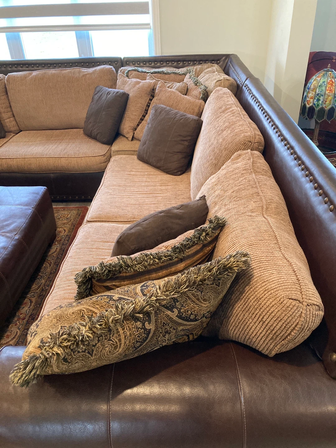 Extremely comfortable brown leather and cloth sectional sofa that comes with an ottoman. The sofa has a unique design with studded detailing and a mix of solid and patterned cushions. It's perfect for a living room or basement Rex room or even a cottage and offers plenty of seating space!