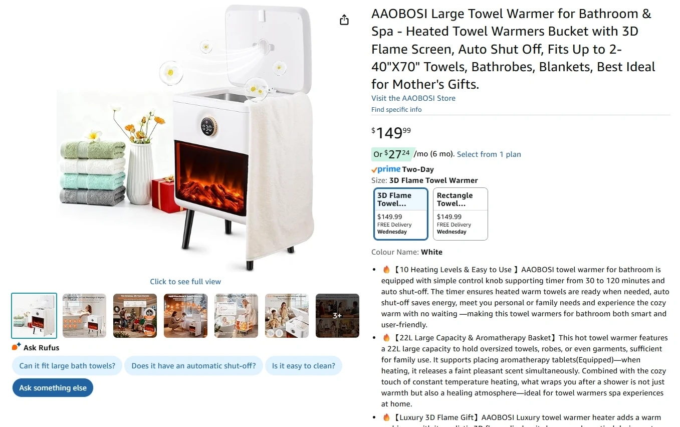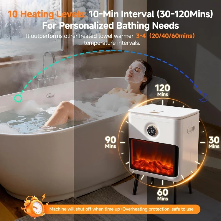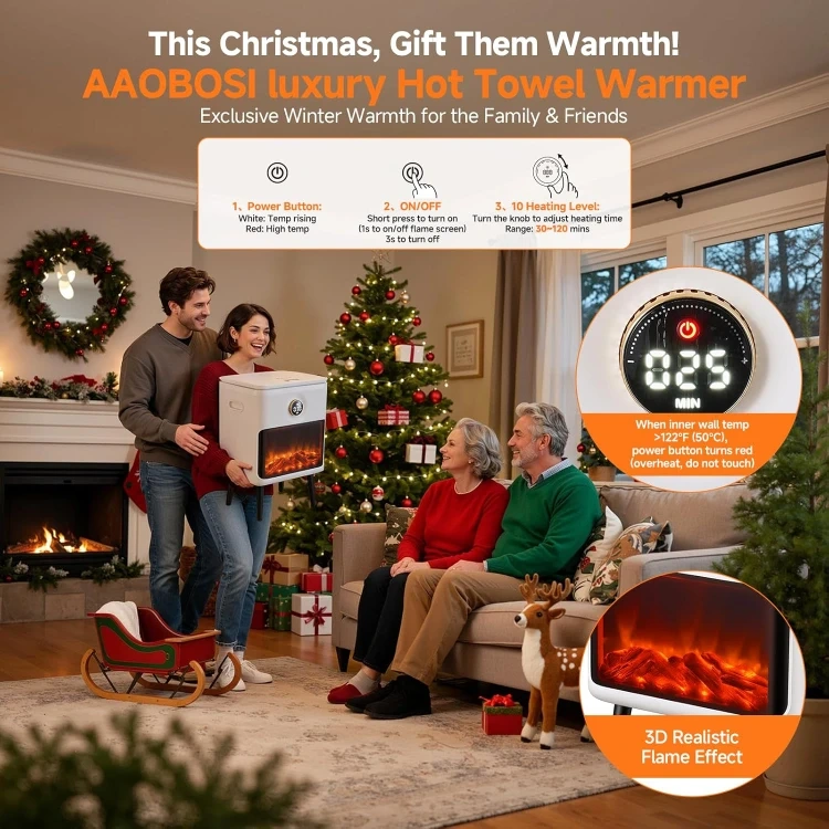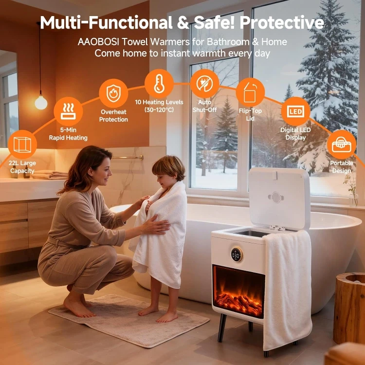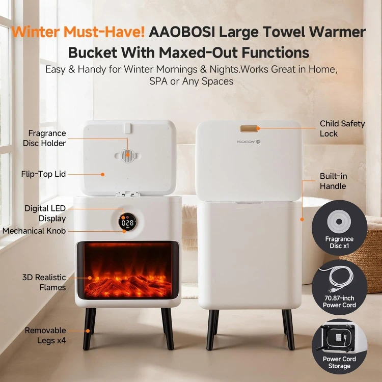 754Large Towel Warmer for Bathroom & Spa - Heated Towel Warmers Bucket with 3D Flame Screen, Auto Shut Off, Fits Up to 2-40"X70" Towels, Bathrobes, Blankets, Best Ideal for Mother's Gifts, Brand New in the Box/Sealed Sells for $150+tax on Amazon https://www.amazon.ca/dp/B0FMRX5RL4 Features: 【10 Heating Levels & Easy to Use 】AAOBOSI towel warmer for bathroom is equipped with simple control knob supporting timer from 30 to 120 minutes and auto shut-off. The timer ensures heated warm towels are ready when needed, auto shut-off saves energy, meet you personal or family needs and experience the cozy warm with no waiting —making this towel warmers for bathroom both smart and user-friendly. 【22L Large Capacity & Aromatherapy Basket】This hot towel warmer features a 22L large capacity to hold oversized towels, robes, or even garments, sufficient for family use. It supports placing aromatherapy tablets(Equipped)—when heating, it releases a faint pleasant scent simultaneously. Combined with the cozy touch of constant temperature heating, what wraps you after a shower is not just warmth but also a healing atmosphere—ideal for towel warmers spa experiences at home. 【Luxury 3D Flame Gift】AAOBOSI Luxury towel warmer heater adds a warm ambiance with its realistic 3D flame display, its luxury and practical design not only fits your own bathroom but also serves as a thoughtful gift for loved ones. No Stress Picking Holiday Gifts! AAOBOSI Towel Warmers—warm, practical, and widely loved. 【30S Fast & 239℉ Even Heat Up】This large towel warmer adopts NTC Heating Module + Stainless Steel Interior, surround-side heating heating up in 30 seconds with even temperature distribution. Up to 239℉(115℃), evenly transfer warmth from all sides, enveloping your towels in gentle, consistent heat. 【Safe & Easy to Operate】 Safety is a top priority for this heated towel warmer bucket! Equipped with overheat protection, child safety lock, and auto shut-off, it’s totally worry-free for kids and elders. Ideal as a spa towel warmer or hotel towel warmer, it blends relaxation and security seamlessly. It's the perfect gift for Christmas, Father's Day, Mother's Day, Valentine's Day, friends' birthdays, and Gatherings. When inner wall temp >122°F (50°C), power button turns Red (Overheat, Do n't Touch). 【Cotton & Cotton Blend Only】
