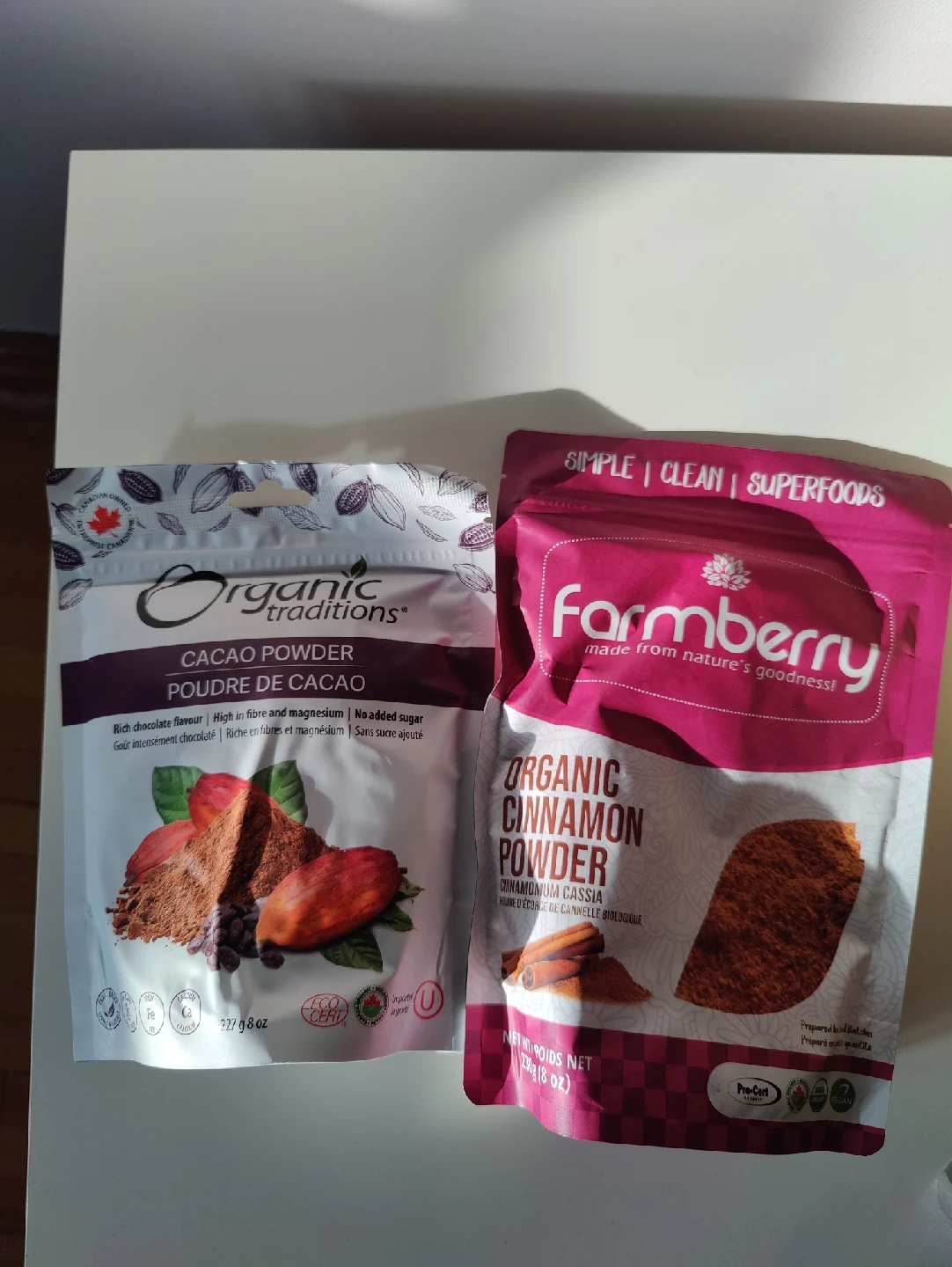 Both are perfect for adding to smoothies, baking, or hot chocolate! The Farmberry Cinnamon Powder has a best before date of December 2026, and the Organic Traditions Cacao Powder has a best before date of April 2027