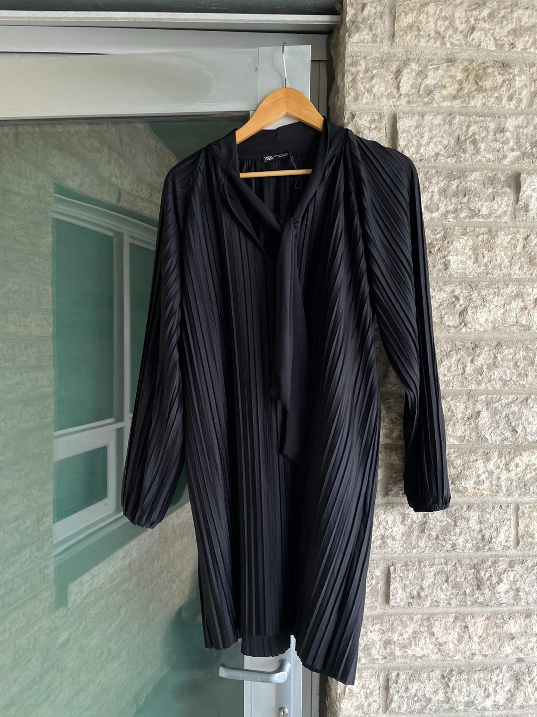 Selling a Zara black pleated dress with a tie neck. It's a size medium and in great condition! The dress has a lovely pleated texture and a stylish tie detail at the neck. Perfect for any occasion