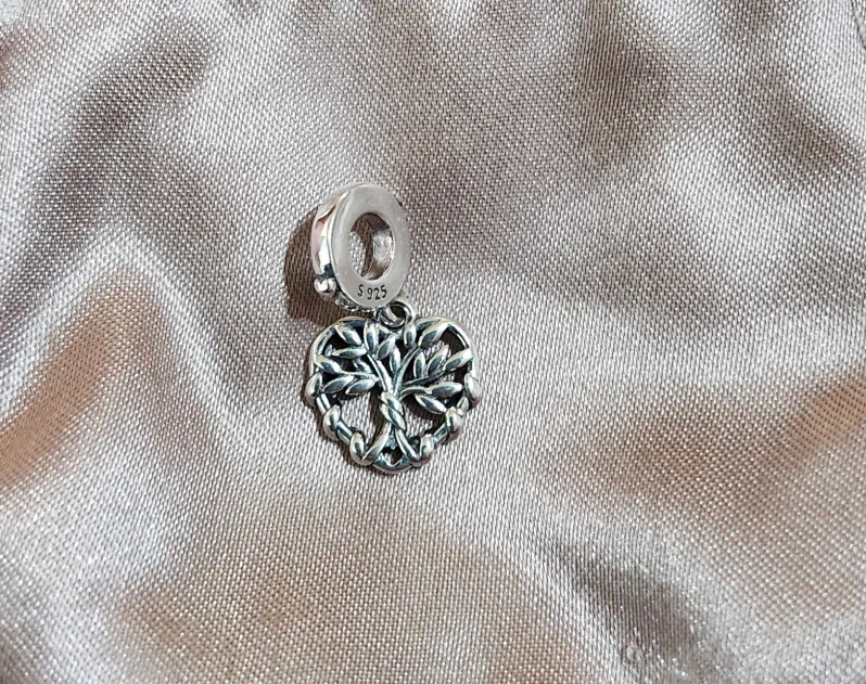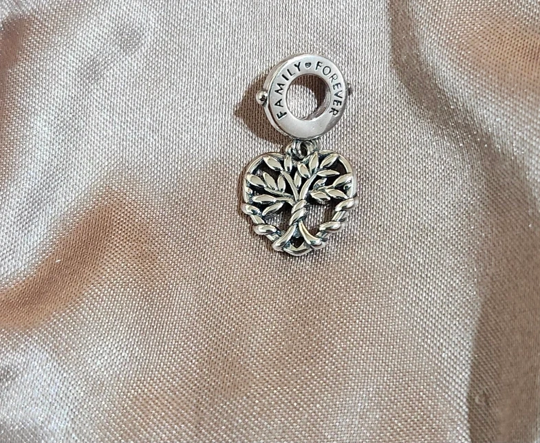522Selling a Family Tree charm. It would look lovely on a bracelet or necklace. The charm is made of sterling silver and features a detailed tree design. It also has 'Family Forever' engraved on the side.
