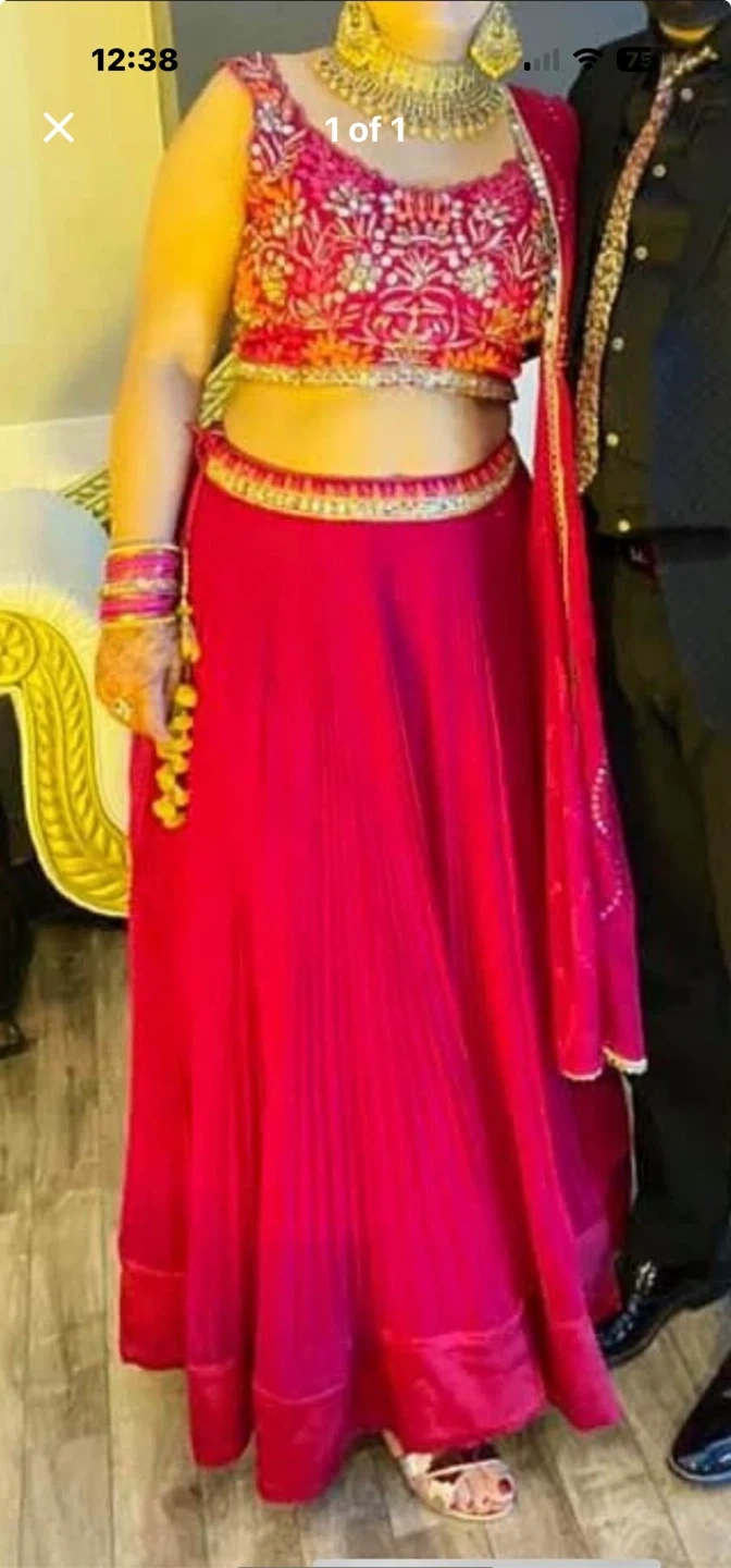 Beautiful red lehenga choli set, perfect for a special occasion! The set includes a skirt, blouse, and dupatta. The blouse is intricately embroidered, and the skirt has a lovely flow. Size medium