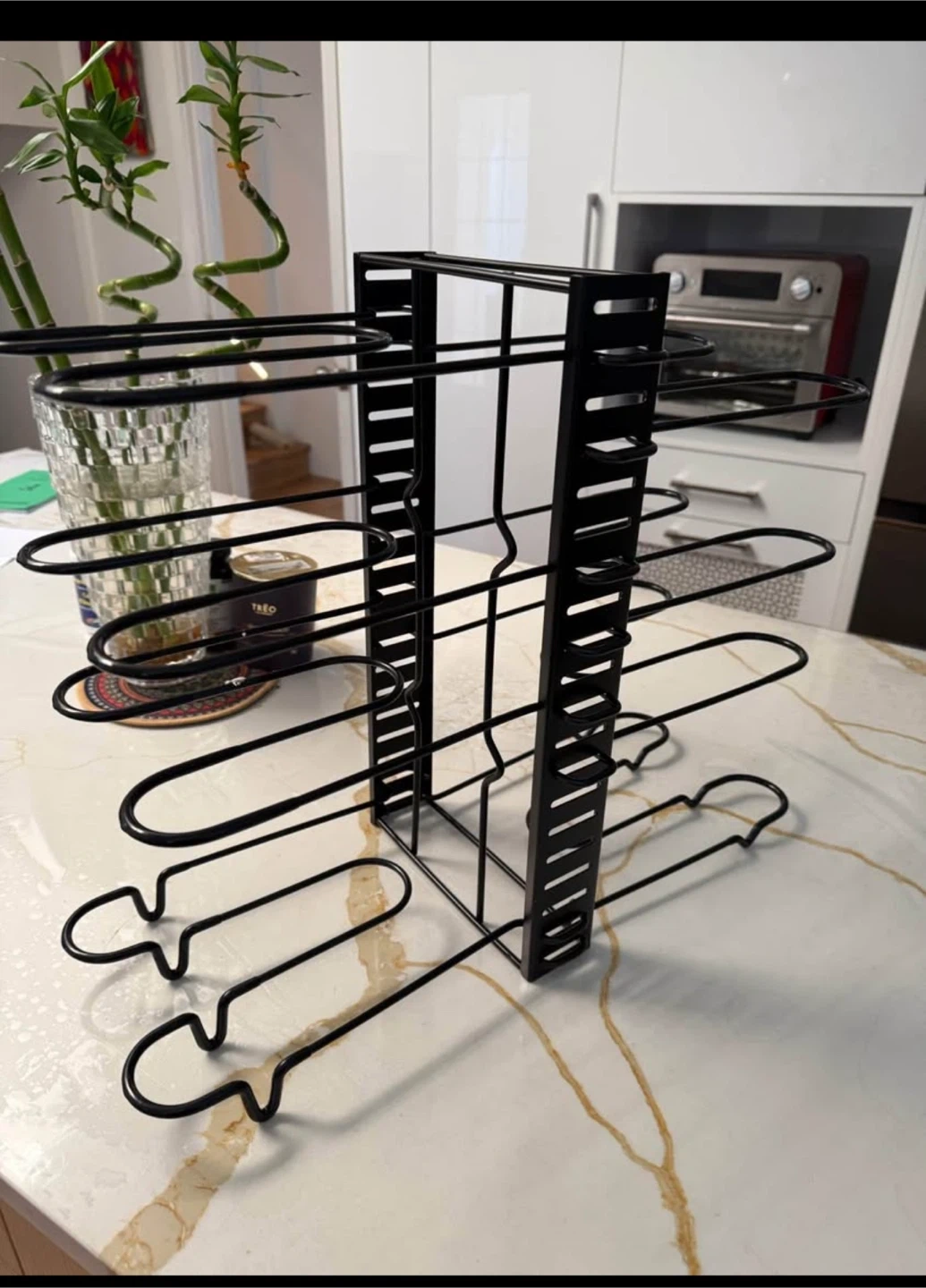 This is a black pan organizer rack, perfect for keeping your pots and pans tidy! It's in great shape and ready to help you declutter your kitchen very strong and adjustable too, brand new from amazon