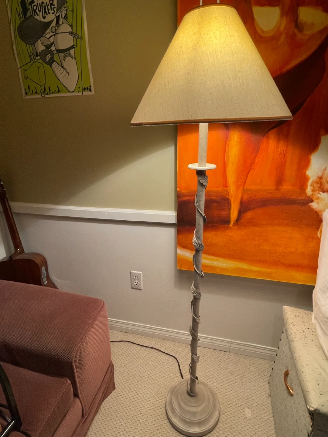 Selling a floor lamp that would look great in any living room or bedroom. It features a unique design with leaf accents and a neutral colour that blends well with most decors