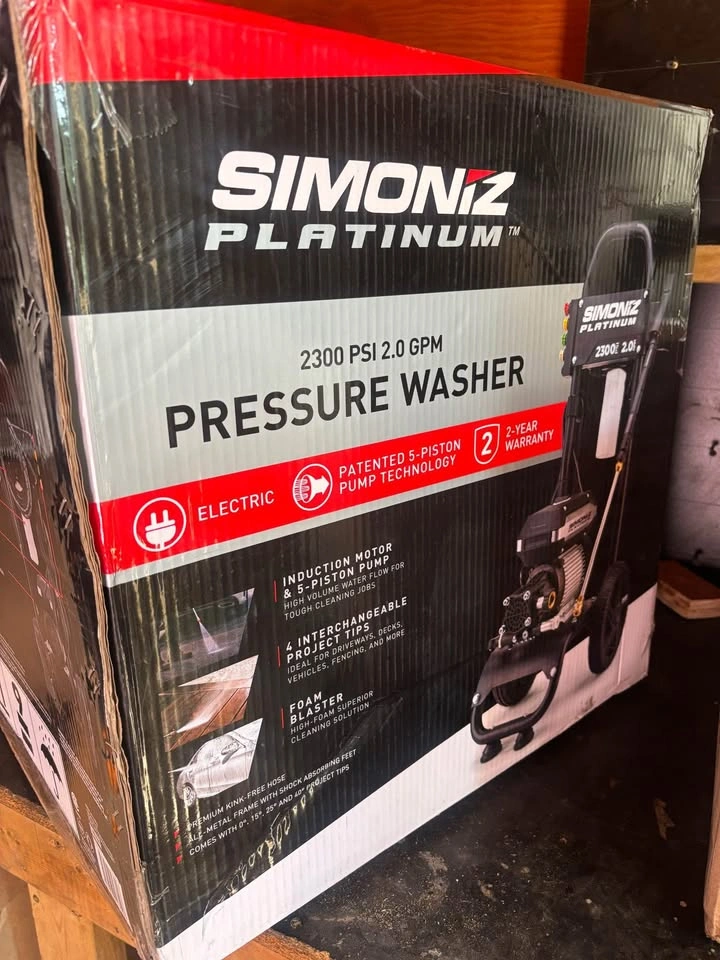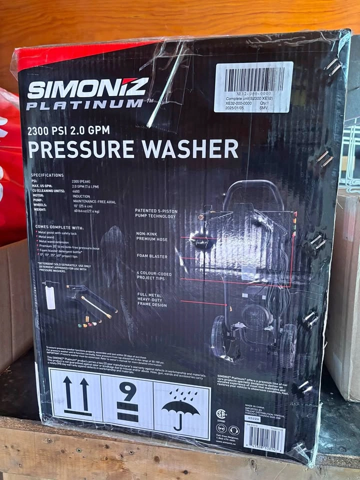 Simoniz pressure Washer. Brand new, unopened box. Retail is $500 before tax. 2300 PSI, 2 Year Warranty. Can provide receipt if needed. Comes with all attachments, hose, foam canon, etc.