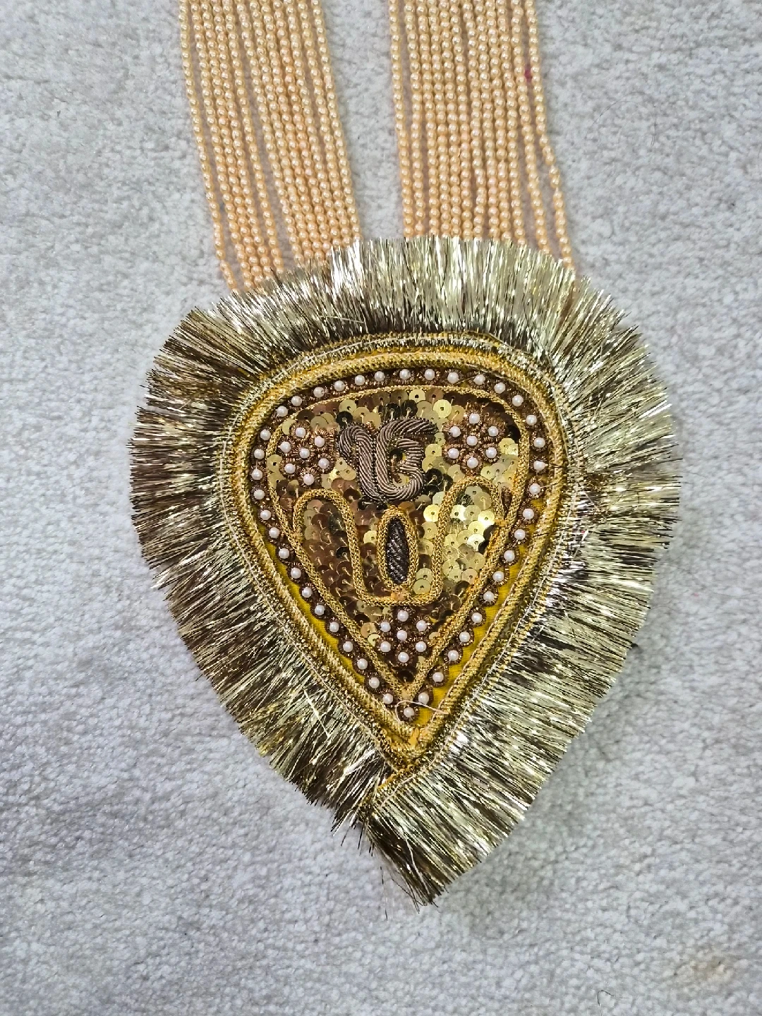 10This is a decorative necklace featuring intricate beadwork and sequin detailing. It has a unique design with a combination of beaded strands and a central sequined pendant. Often used at weddings and pooja.