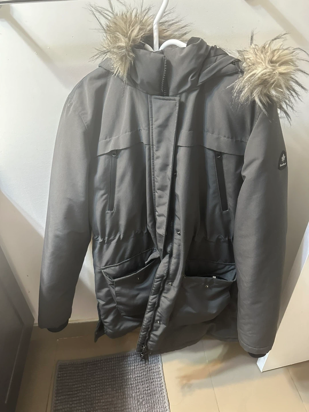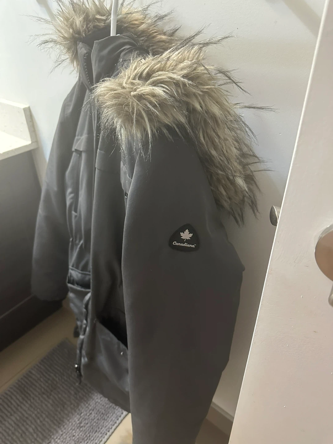 Selling a Canadiana winter parka in great condition! It's perfect for staying warm during those cold Canadian winters. The parka features a faux fur-trimmed hood and plenty of pockets for storage.